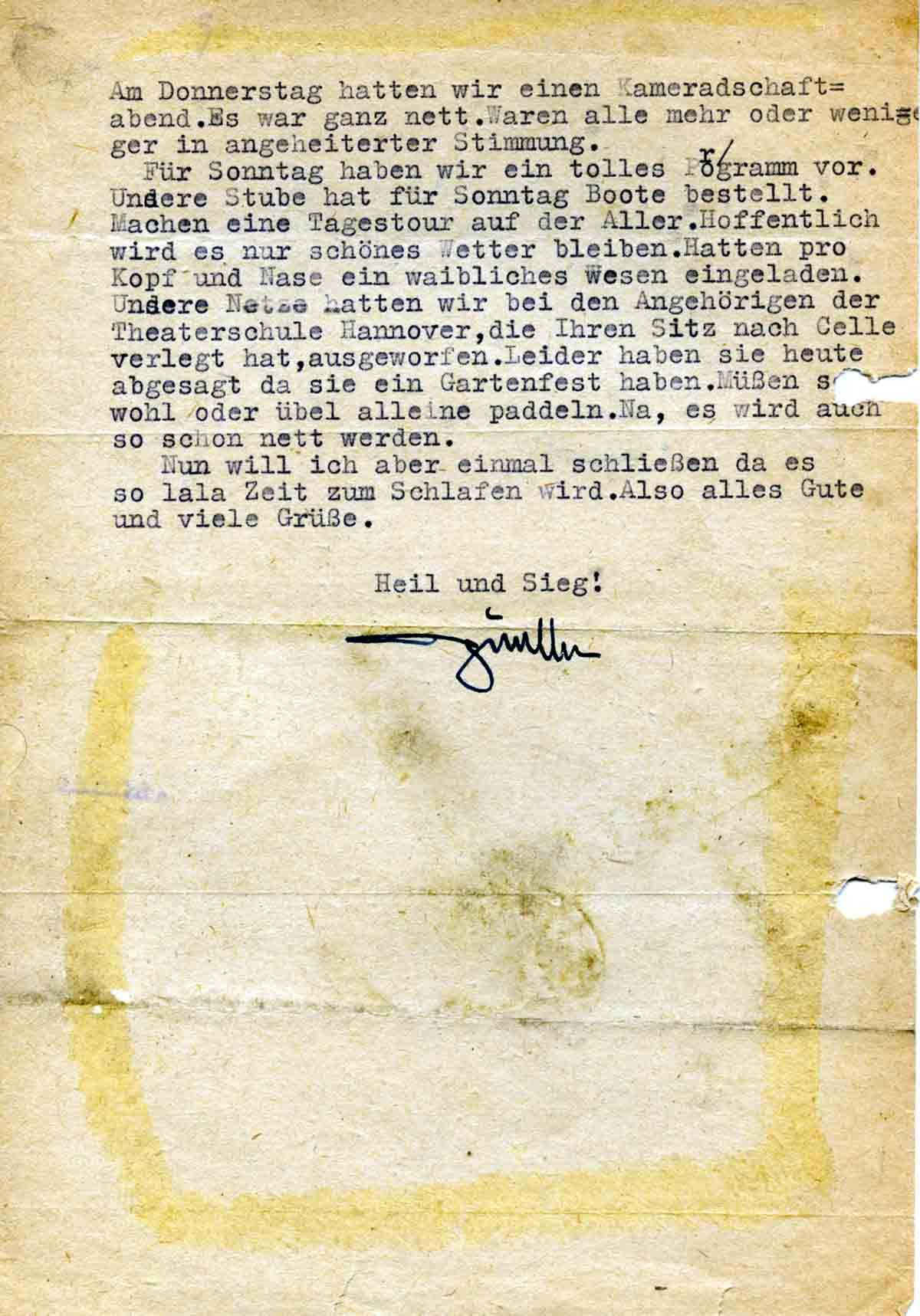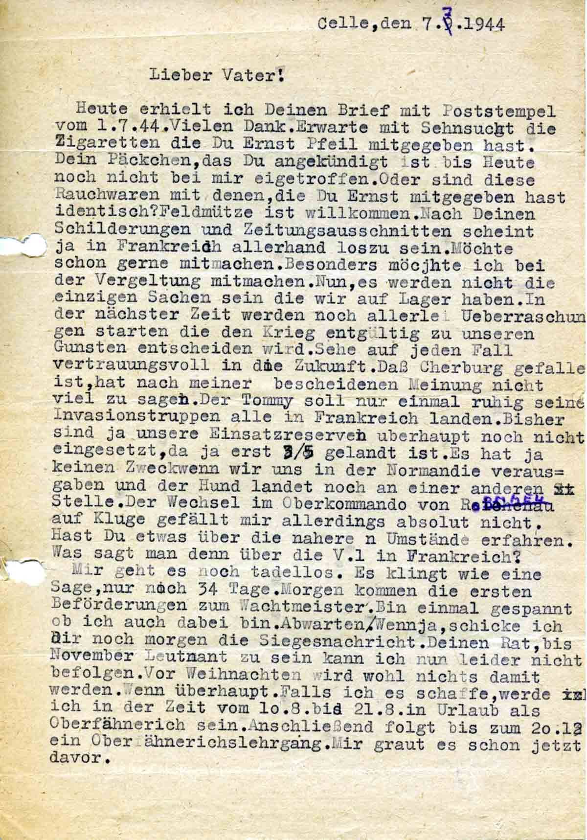 Heute erhielt ich Deinen Brief mit Poststempel vom 1.7.44. Vielen Dank. Erwarte mit Sehnsucht die Zigaretten die Du Ernst Pfeil mitgegeben hast. Dein Päckchen, das Du angekündigt ist bis Heute noch nicht bei mir eingetroffen. Oder sind diese Rauchwaren mit denen, die Du Ernst mitgegeben hast identisch? Feldmütze ist willkommen. Nach Deinen Schilderungen und Zeitungsausschnitten scheint ja in Frankreich allerhand los zu sein. Möchte schon gerne mitmachen. Besonders möchte ich bei der Vergeltung mitmachen. Nun, es werden nicht die einzigen Sachen sein die wir auf Lager haben. In der nächster Zeit werden noch allerlei Ueberraschungen starten die den Krieg entgültig zu unseren Gunsten entscheiden wird. Sehe auf jeden Fall vertrauungsvoll in die Zukunft. Daß Cherburg gefalle ist, hat nach meiner bescheidenen Meinung nicht viel zu sagen. Der Tommy soll nur einmal ruhig seine Invasionstruppen alle in Frankreich landen. Bisher sind ja unsere Einsatzreserven überhaupt noch nicht eingesetzt, da ja erst 3/5 gelandt ist .Es hat ja keinen Zweck wenn wir uns in der Normandie verausgaben und der Hund landet noch an einer anderen Stelle. Der Wechsel im Oberkommando von Rommel auf Kluge gefällt mir allerdings absolut nicht. Hast Du etwas über die nähere n Umstände erfahren. Was sagt man denn über die V. 1 in Frankreich?