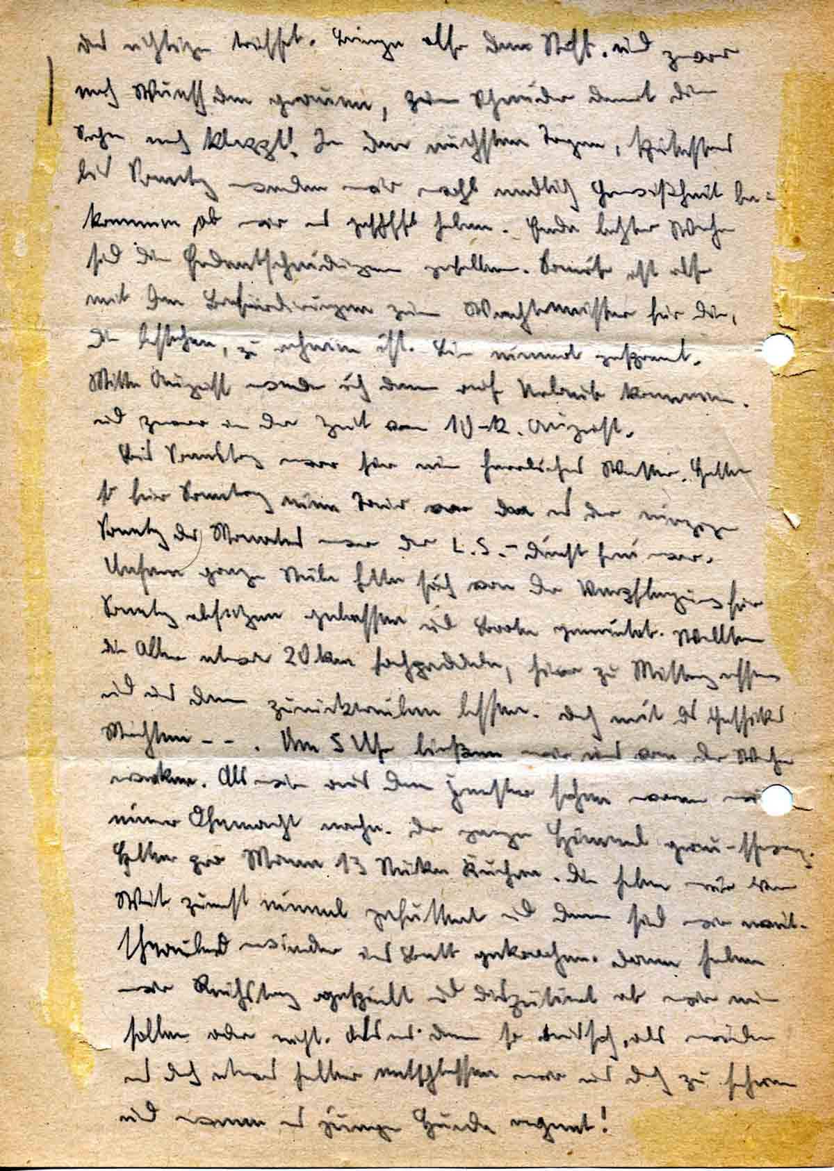 Heute erhielt ich Deinen Brief vom 7.7. Vielen Dank! Daß es mit dem Einmachen ein Fiasko ist, kann ich mir lebhaft vorstellen. Dann hast Du ja jetzt auch genug zu tun, An die Geburtstage habe ich auch schon gedacht, und die Briefe sind schon unterwegs. Daß der alte Pink in den Himmel eingegangen ist, ist kein Verlust für Deutschland. Daß der schöne Hugo Uffz. geworden ist, erschüttert mich nicht. Mich wundert in dieser Beziehung nichts mehr. Mit dem Anzug hat es folgendes auf sich: Als Offizier - falls ich es werde - kann ich in Uniform nicht mehr das tun, was ich als Uffz. machen konnte. Dann ist Zivil, besonders im Sommer, bedeutend bequemer als die dicke Uniform, Anbei schicke ich meine Maße. Metternich wird schon damit zurecht kommen. Er soll schon zuschneiden, damit ich nur noch anzuproben brauche, und somit in 2 bis 3 Tagen den Anzug haben kann. Würde mich auf jeden Fall sehr freuen. Er soll einen Sportanzug bauen. Hose lang genug und unten weit. Den Rock etwa in der Form des hellen, alten Anzuges, damit ich ihn auch eventuell auf Reithosen tragen kann als Räuberzivil. Also spreche mal mit dem guten Mann und teile ihm meine Wünsche mit. Hoffe, daß er