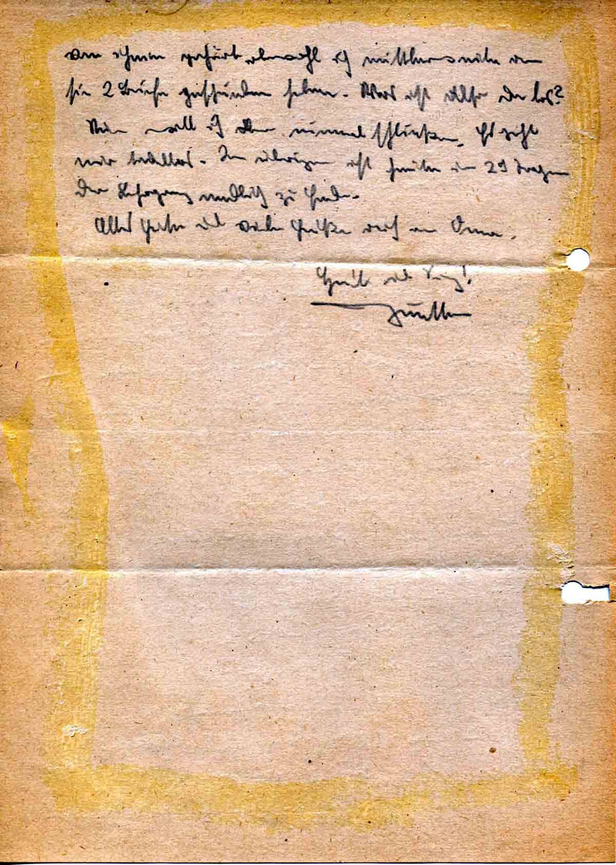 Marken habe ich keine mehr notwendig. Muß zuerst einmal die alten verfressen, da sie ja am 26. verfallen. Brauchst also nichts zu schicken. Jedoch kannst Du mir ein Päckchen Belgischen Tabak schicken, die im Buffet liegen, falls das Paket von Ernst Pfeil nicht so bald ankommt.