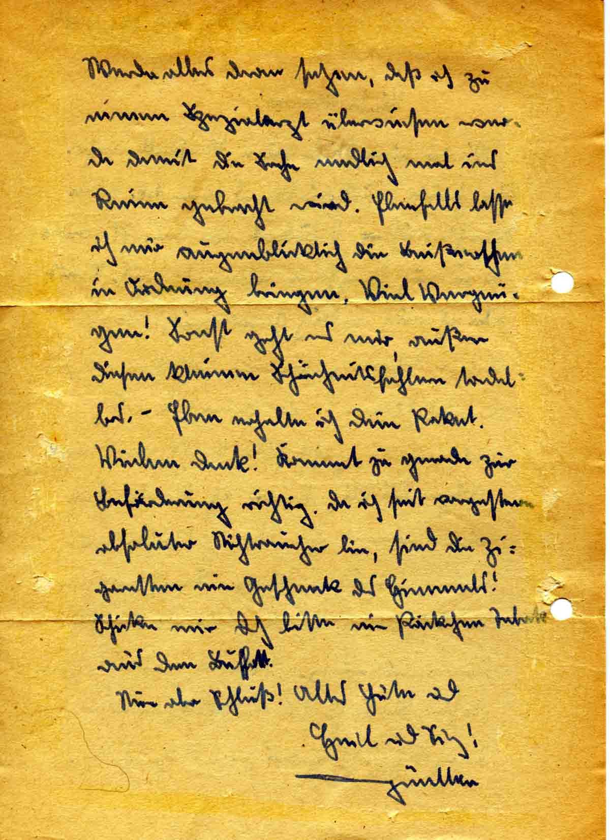 Werde alles daran setzen, daß ich zu einem Spezialarzt überwiesen werde, damit die Sache endlich mal ins Reine gebracht wird. Ebenfalls lasse ich mir augenblicklich die Beißerchen in Ordnung bringen. Viel Vergnügen! Sonst geht es mir, außer diesen kleinen Schönheitsfehlern tadellos. - Eben erhalte ich Dein Paket. Vielen Dank! Kommt gerade zur Beförderung richtig. Da ich seit vorgestern absoluter Nichtraucher bin, sind die Zigaretten ein Geschenk des Himmels! Schicke mir doch bitte ein Päckchen Tabak aus dem Buffet.