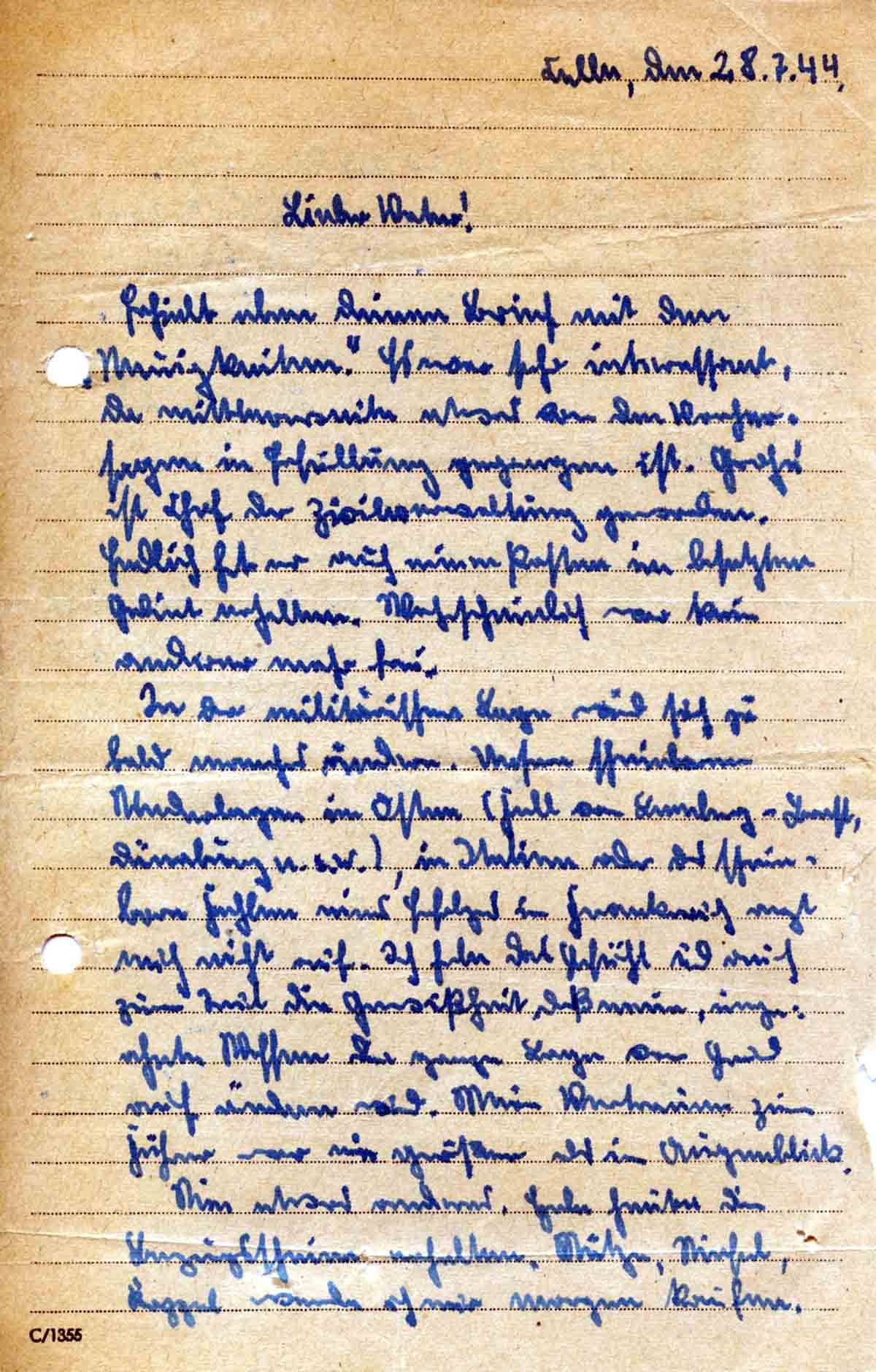 In der militärischen Lage wird sich ja bald manches ändern. Unsere scheinbaren Niederlagen im Osten (Fall von Lemberg, Brest, Dünaburg u.s.w.), in Italien oder das scheinbare Fehlen eines Erfolges in Frankreich regt mich nicht auf. Ich habe das Gefühl und auch zum Teil auch die Gewißheit, daß neue, ungeahnte Waffen die Lage von Grund auf ändern wird. Mein Vertrauen zum Führer war nie größer als im Augenblick.