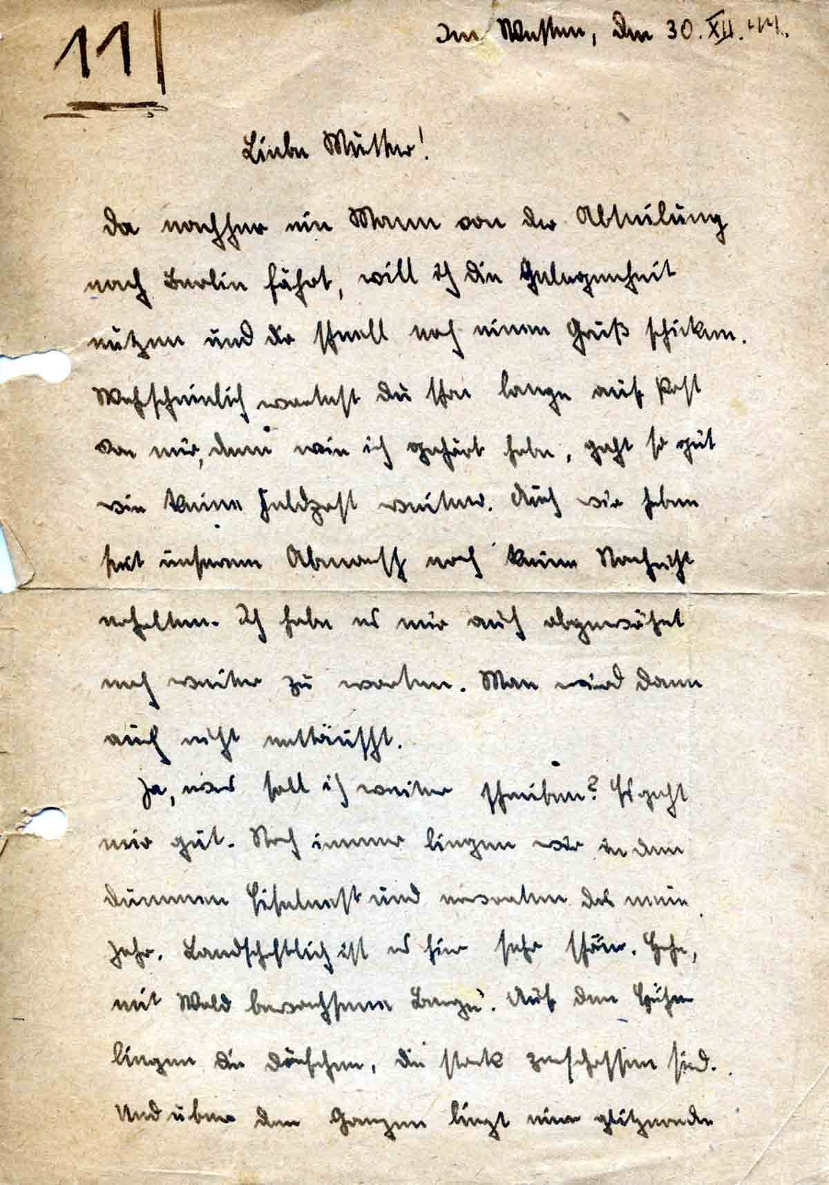 Ja, was soll ich weiter schreiben? Es geht mir gut. Noch immer liegen wir in dem dummen Eifelnest und erwarten das neue Jahr. Landschaftlich ist es hier sehr schön. Hohe, mit Wald bewachsene Berge. Auf den Höhen liegen die Dörfchen, die stark zerschossen sind. Und über dem Ganzen liegt eine glitzernde