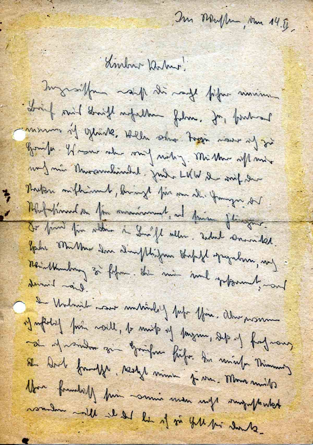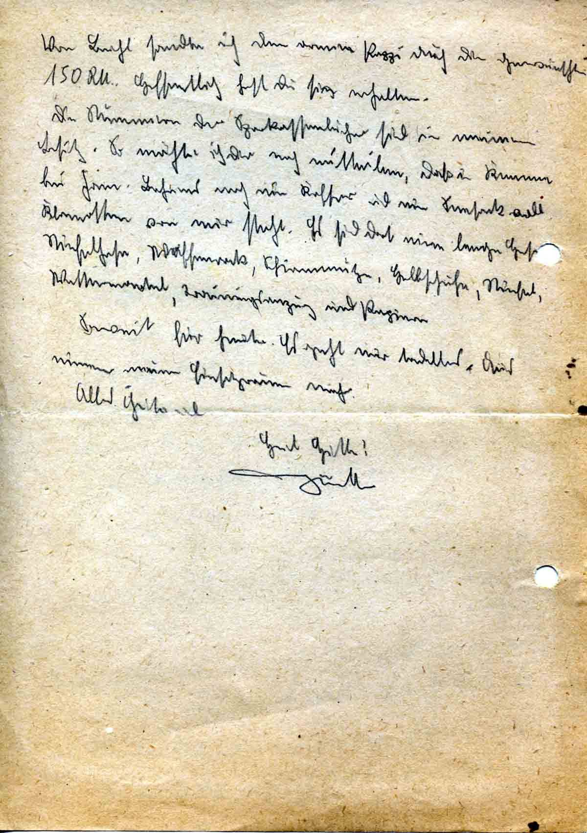 Von Brühl sandte ich dem armen Pappi auch die gewünschten 150 RM. Hoffentlich hast Du sie erhalten.