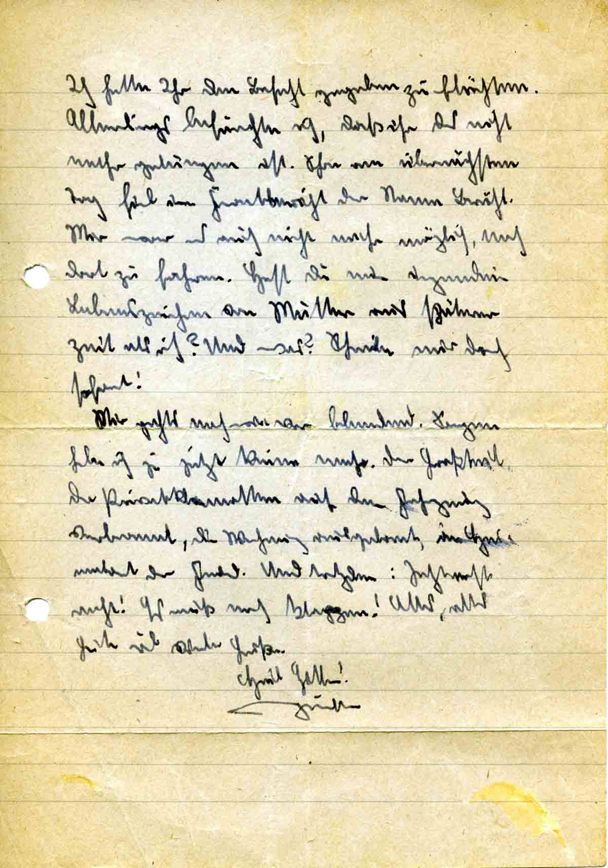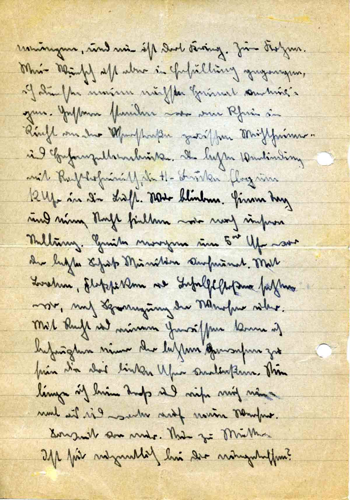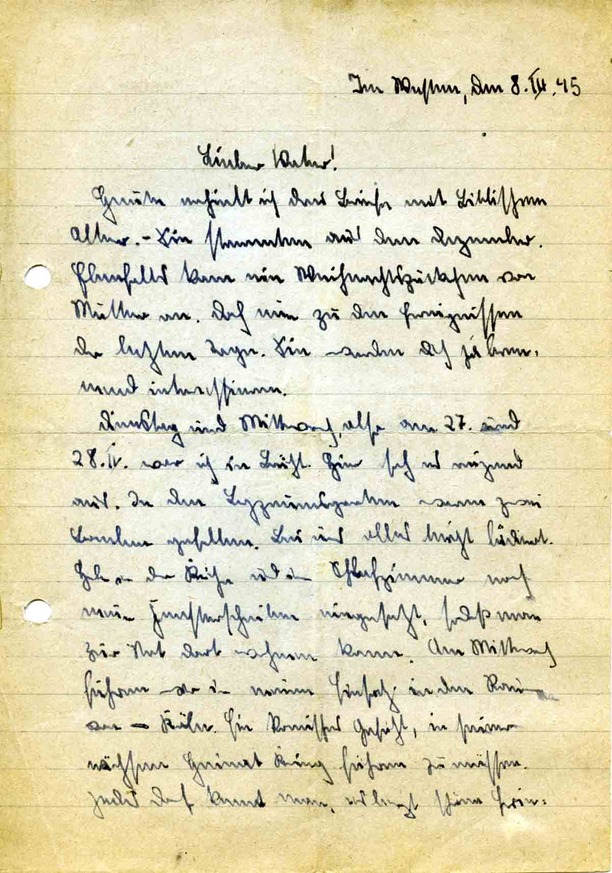Ich hatte ihr den Befehl gegeben zu flüchten. Allerdings befürchte ich, daß ihr das nicht mehr gelungen ist. Schon am übernächsten Tag fiel im Frontbericht der Name Brühl. Mir war es auch nicht mehr möglich, nach dort zu fahren. Hast Du nun irgendein Lebenszeichen von Mutter aus späterer Zeit als ich? Und was? Schreiben mir doch sofort!