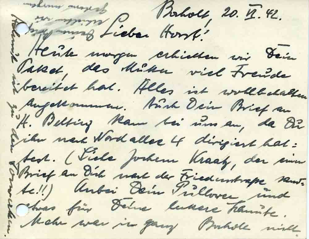 Heute morgen erhielten wir Dein Paket, das Mutter viel Freude bereitet hat. Alles ist wohlbehalten angekommen. Auch Dein Brief an H. Belting kam bei uns an, da Du ihn nach Nordallee 4 dirigiert hattest. (Siehe Jochem Kraatz, der einen Brief an Dich nach der Friedenstraße sandte!!) Anbei Dein Pullover und etwas für Deine leckere Schnute.