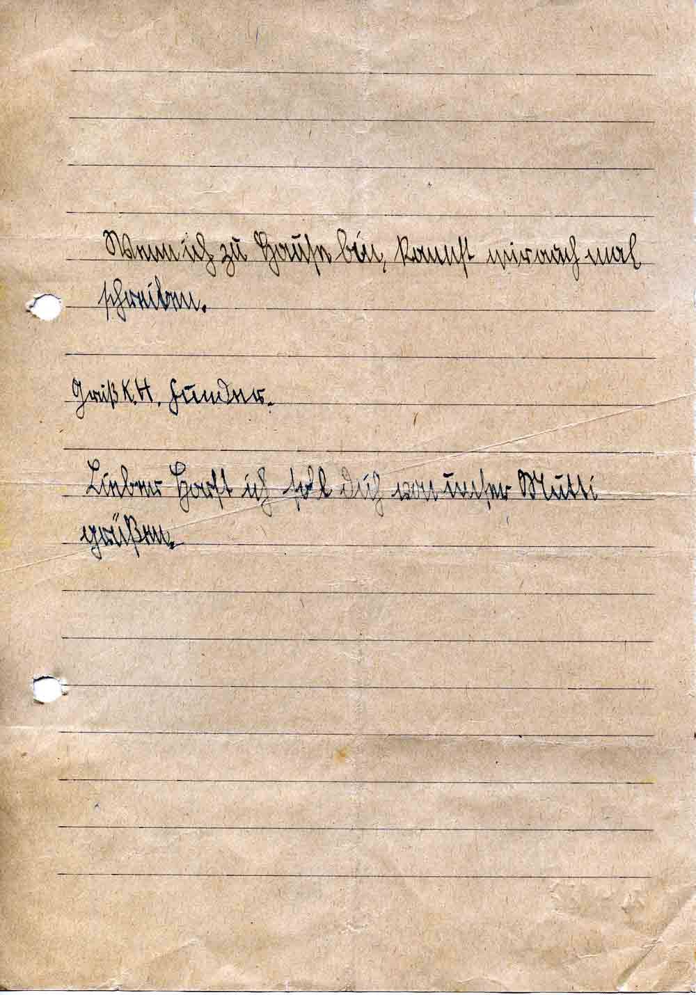 Die besten Grüße von hier sendet Dir Günter Skutnik. Mir geht es noch sehr gut. Wie gefällt es Dir denn in Schloß Grafeneck. Hoffentlich gut. Lieber Horst Du kannst Dir garnicht vorstellen was in unser Lager eine Trauer ist. Der Otto Steinike K.H. Funder ich und dann noch paar haben geweint. Mein Bett steht jetzt an der Stelle wo Dein Bett stand. Dein Glas das Du vergessen hast schicken wir Dich nach. Lieber Horst wenn Du nach Hause fährst, besuchst Du uns sicher mal. Bekommt ihr auch Nachtisch. Jetzt haben wir große Pause. Lieber Horst nun weiß nichts mehr. Es grüßt Dir herzlich