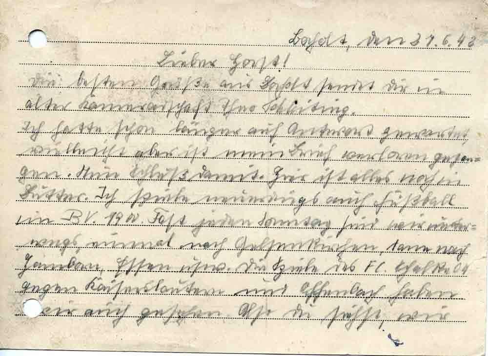Ich hatte schon länger auf Antwort gewartet, vielleicht aber ist mein Brief verloren gegangen. Nun Schluß damit. Hier ist alles noch in Butter. Ich spiele neuerdings auch Fußball im BV.1900. Fast jeden Sonntag sind wir unterwegs, einmal nach Gelsenkirchen, dann nach Hamborn, Essen usw. Die Spiele des FC. Schalke 04 gegen Kaiserslautern und Offenbach haben wir auch gesehen. Also Du siehst, wir