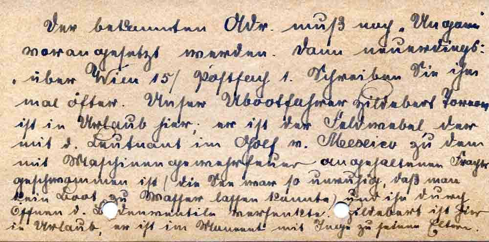 Der bekannten Adr. muß noch „Ungarn“ vorangesetzt werden. Dann neuerdings: „über Wien 15/ Postfach 1. Schreiben Sie ihm mal öfter. Unser Ubootfahrer Hildebert Toeren ist in Urlaub hier; er ist der Feldwebel, der mit d. Leutnant im Golf v. Mexico zu dem mit Maschinengewehrfeuer angehaltenen Frachter geschwommen ist (die See war so unruhig, daß man kein Boot zu Wasser lassen konnte) und ihn durch Öffnen d. Bodenventile versenkte. Hildebert ist hier in Urlaub, er ist im Moment mit Inge zu seinen Eltern.