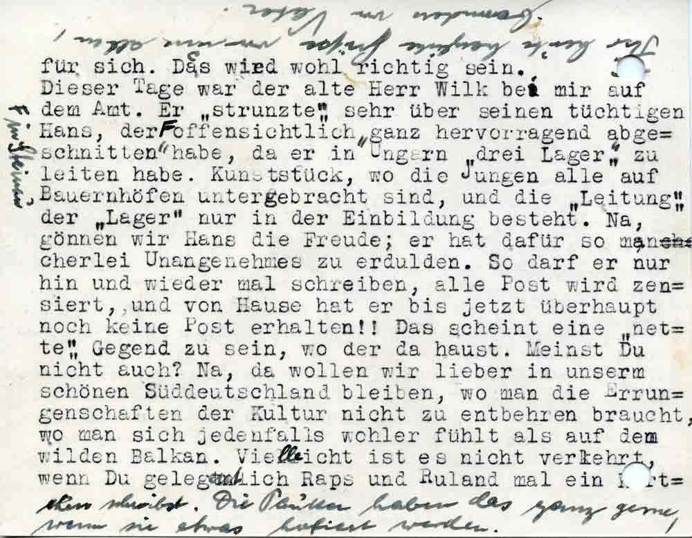 Dieser Tage war der alte Herr Wilk bei mir auf dem Amt. Er „strunzte“ sehr über seinen tüchtigen Hans, der in Steinau offensichtlich „ganz hervorragend abgeschnitten“ habe, da er in Ungarn „drei Lager“ zu leiten habe. Kunststück, wo die Jungen alle auf Bauernhöfen untergebracht sind, und die „Leitung“ der „Lager“ nur in der Einbildung besteht. Na, gönnen wir Hans die Freude; er hat dafür so mancherlei Unangenehmes zu erdulden. So darf er nur hin und wieder mal schreiben, alle Post wird zensiert, und von Hause hat er bis jetzt überhaupt noch keine Post erhalten!! Das scheint eine „nette“ Gegend zu sein, wo der da haust. Meinst Du nicht auch? Na, da wollen wir lieber in unserm schönen Süddeutschland bleiben, wo man die Errungenschaften der Kultur nicht zu entbehren braucht, wo man sich jedenfalls wohler fühlt als auf dem wilden Balkan. Vielleicht ist es nicht verkehrt, wenn Du gelegentlich Raps und Ruland mal ein Kärtchen schreibst. Die Pauker haben das ganz gerne, wenn sie etwas hofiert werden.