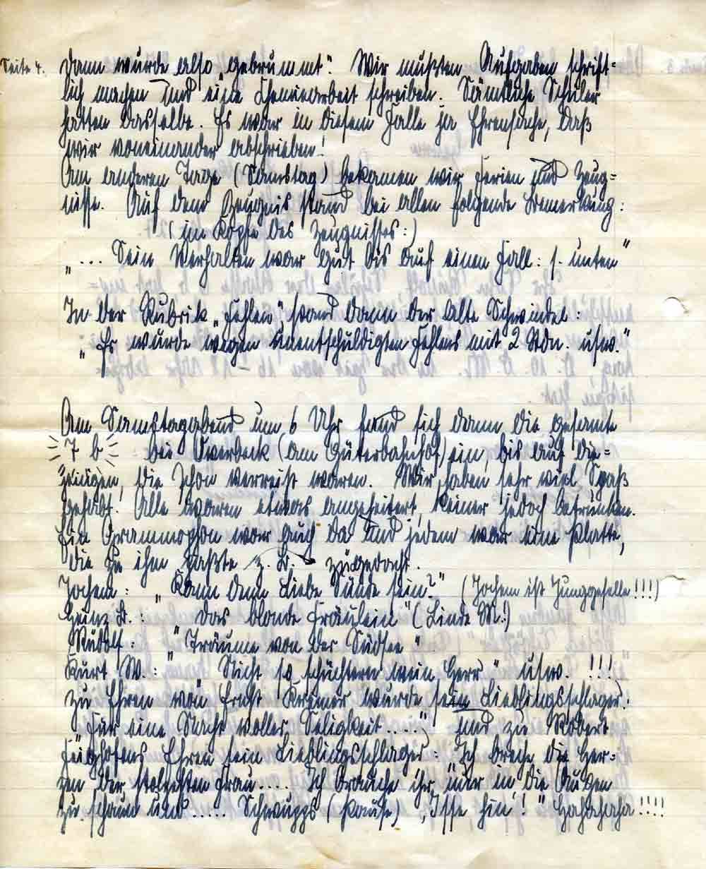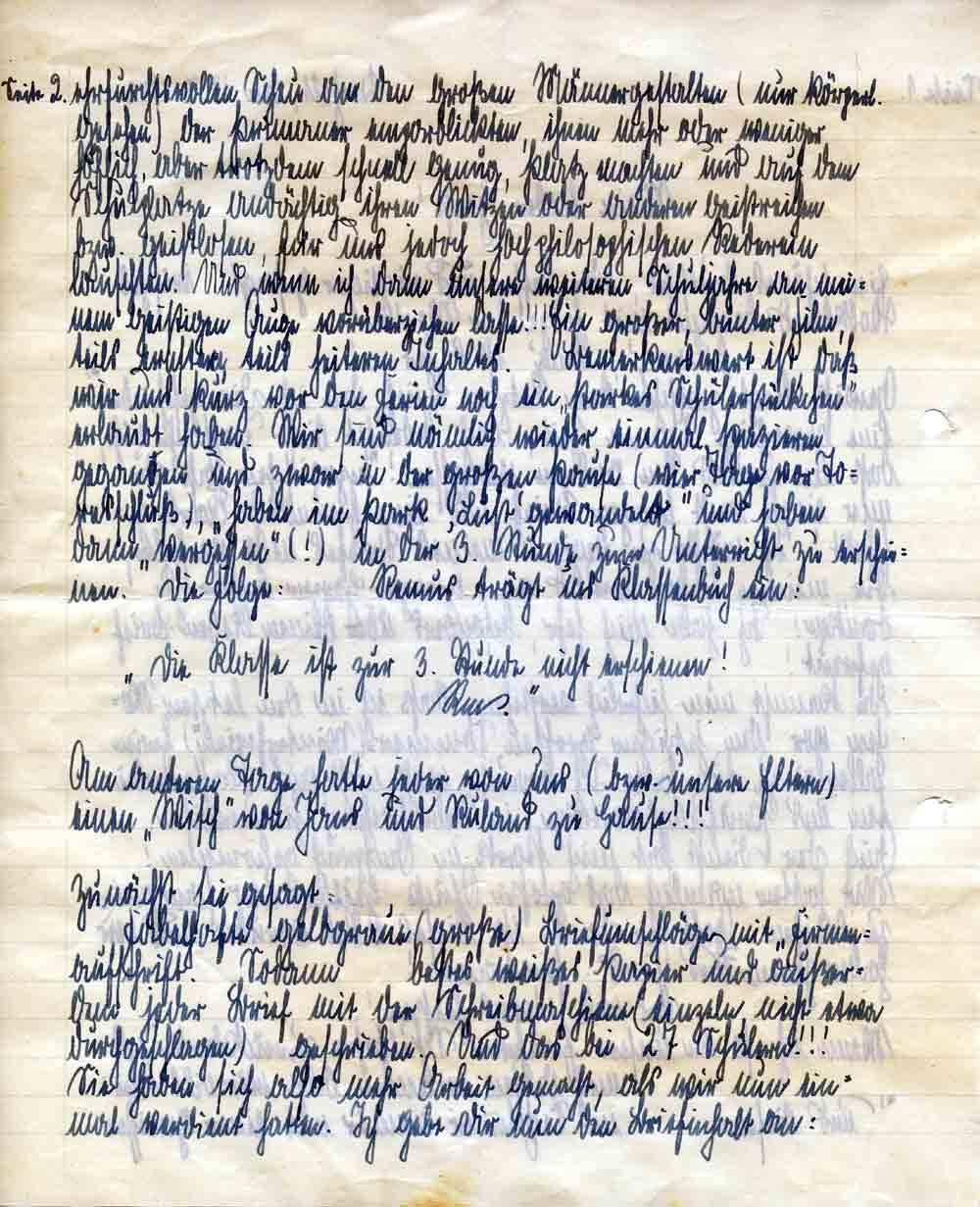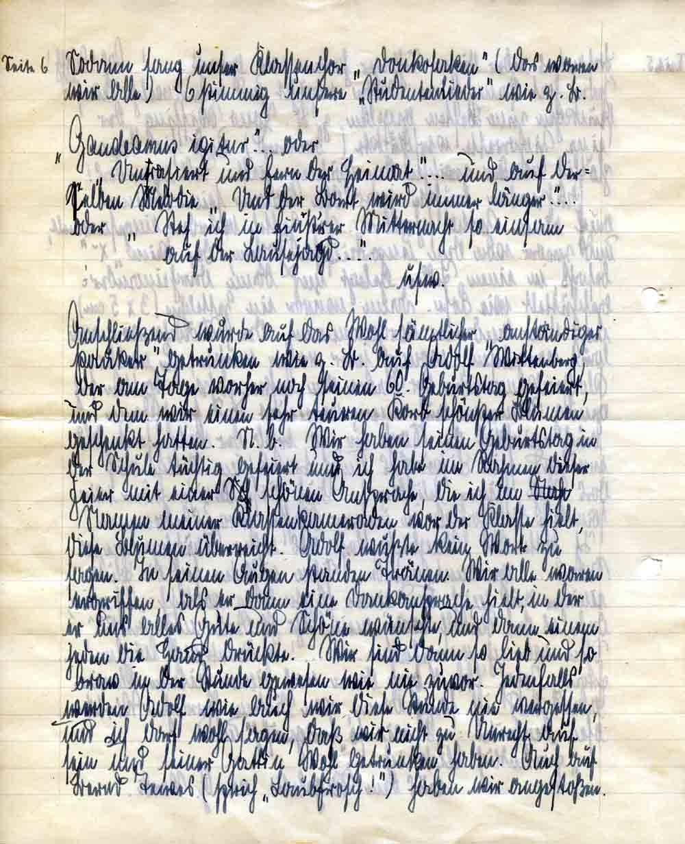Zu bemerken wäre, daß der neue Tanzkursus auch vor kurzem seine Schlußfeier sah. Getanzt habe ich in letzter Zeit nicht mehr. Nun haben sämtliche Mitschüler von uns an Tanzkursen teilgenommen. Jans hat das mit Entsetzen vor der ganzen Klasse feststellen können. Übrigens sitze ich in allen Lateinstunden neben Heinz. Wir sitzen J. direkt vor der Nase und machen uns über jeden Mist, den der „Alte“ verzapft, lustig. Verschiedene Male wäre Heinz um ein Haar herausgeflogen. Ach da bin ich ja schon wieder mit der Schule....