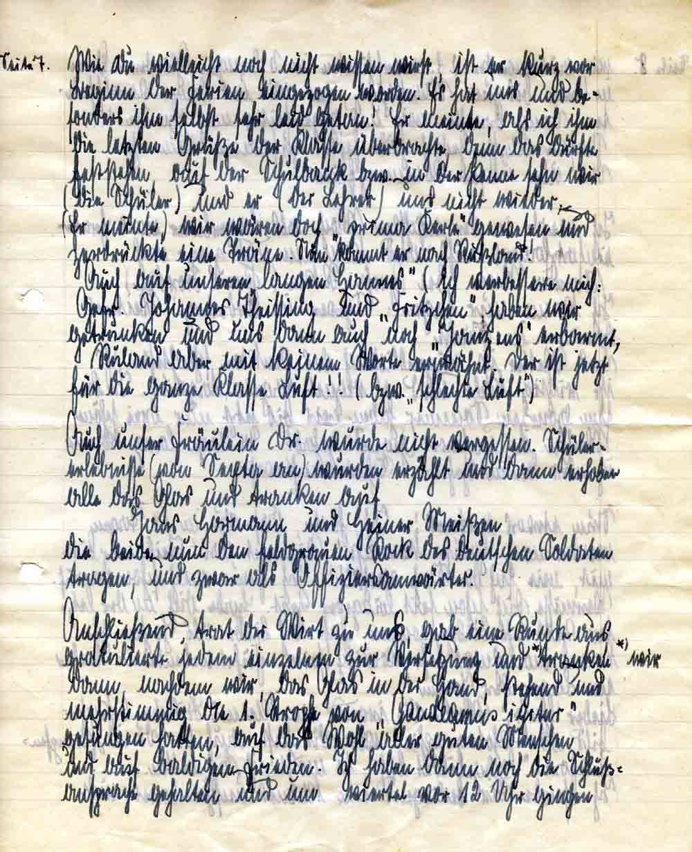 Ich wäre ihr bald auf offener Straße um den Hals gefallen und sie hat mir wohl eine Viertelstunde lang die Hand geschüttelt und gelacht und gefragt ... ich wußte nicht wohin! Wohl eine Stunde lang haben wir noch gequatscht und sie hätte bald noch meinetwegen den Zug verpaßt. Habe sie noch zur Bahn gebracht und sie hat mir dann aufgetragen „Ihre 6 b (jetzt 7 b) auf das Herzlichste von Ihr zu grüßen! Das habe ich bei allen getan und möchte es jetzt bei Dir, meinem lieben Horst, auch besorgen.