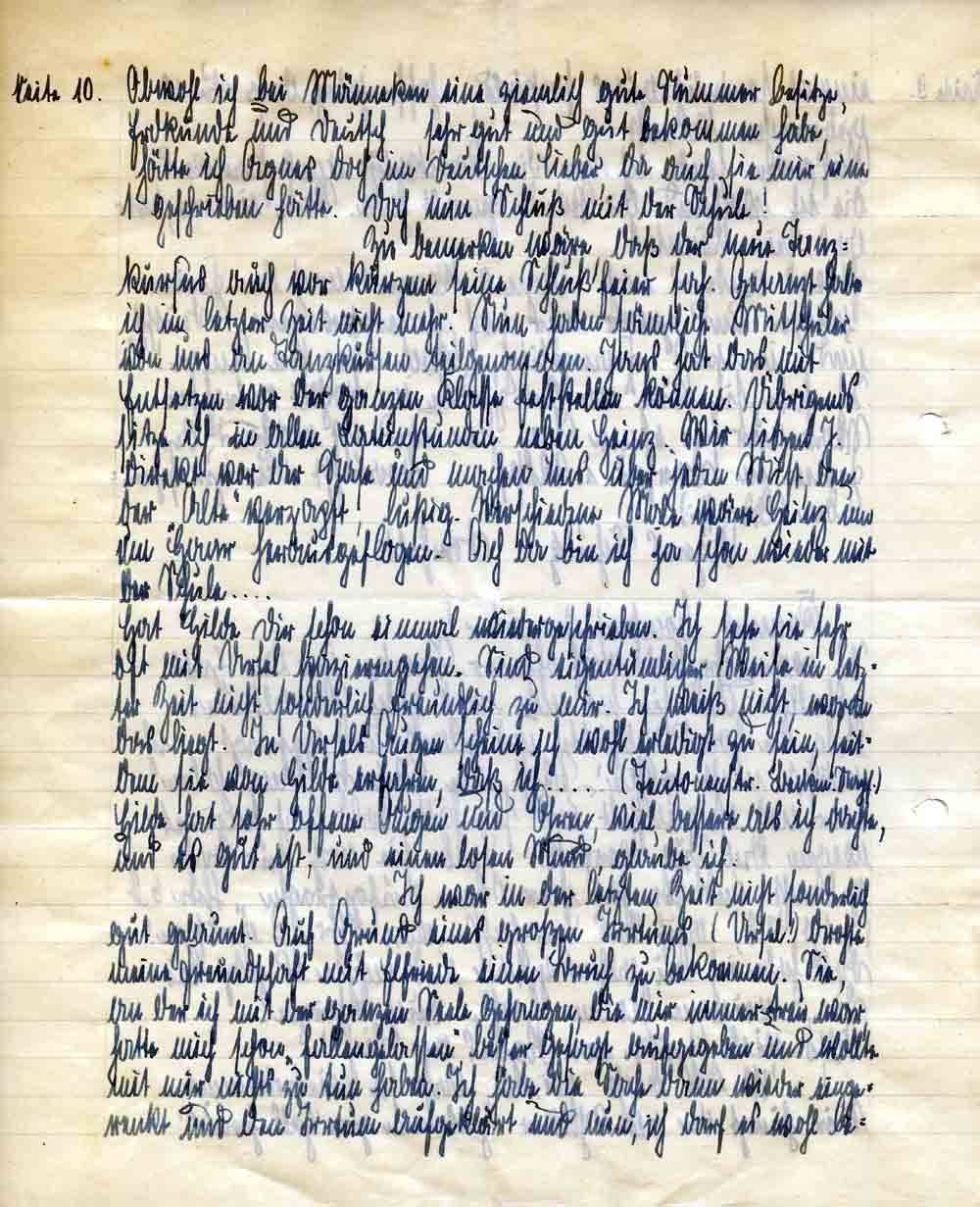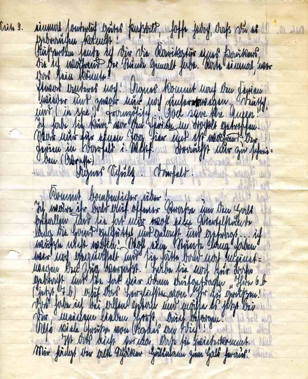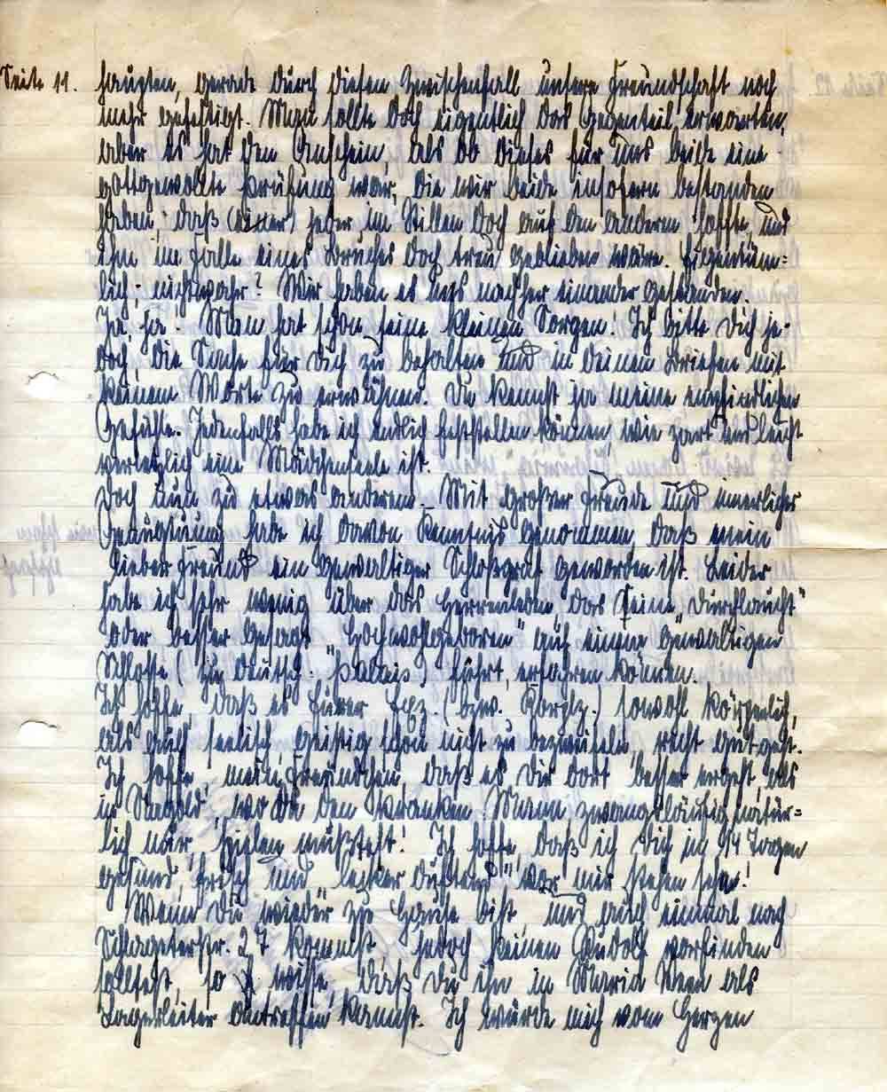 Hat Hilde Dir schon einmal wiedergeschrieben. Ich sehe sie sehr oft mit Ursel spazierengehen. Sind eigentümlicher Weise in letzter Zeit nicht sonderlich freundlich zu mir. Ich weiß nicht, woran das liegt. In Ursels Augen scheine ich wohl erledigt zu sein, seitdem sie von Hilde erfahren, daß ich .... (Teutonenstr. Beckm. Nachf.) Hilde hat sehr offene Augen und Ohren, viel bessere als ich dachte, und es gut ist, und einen losen Mund, glaube ich.