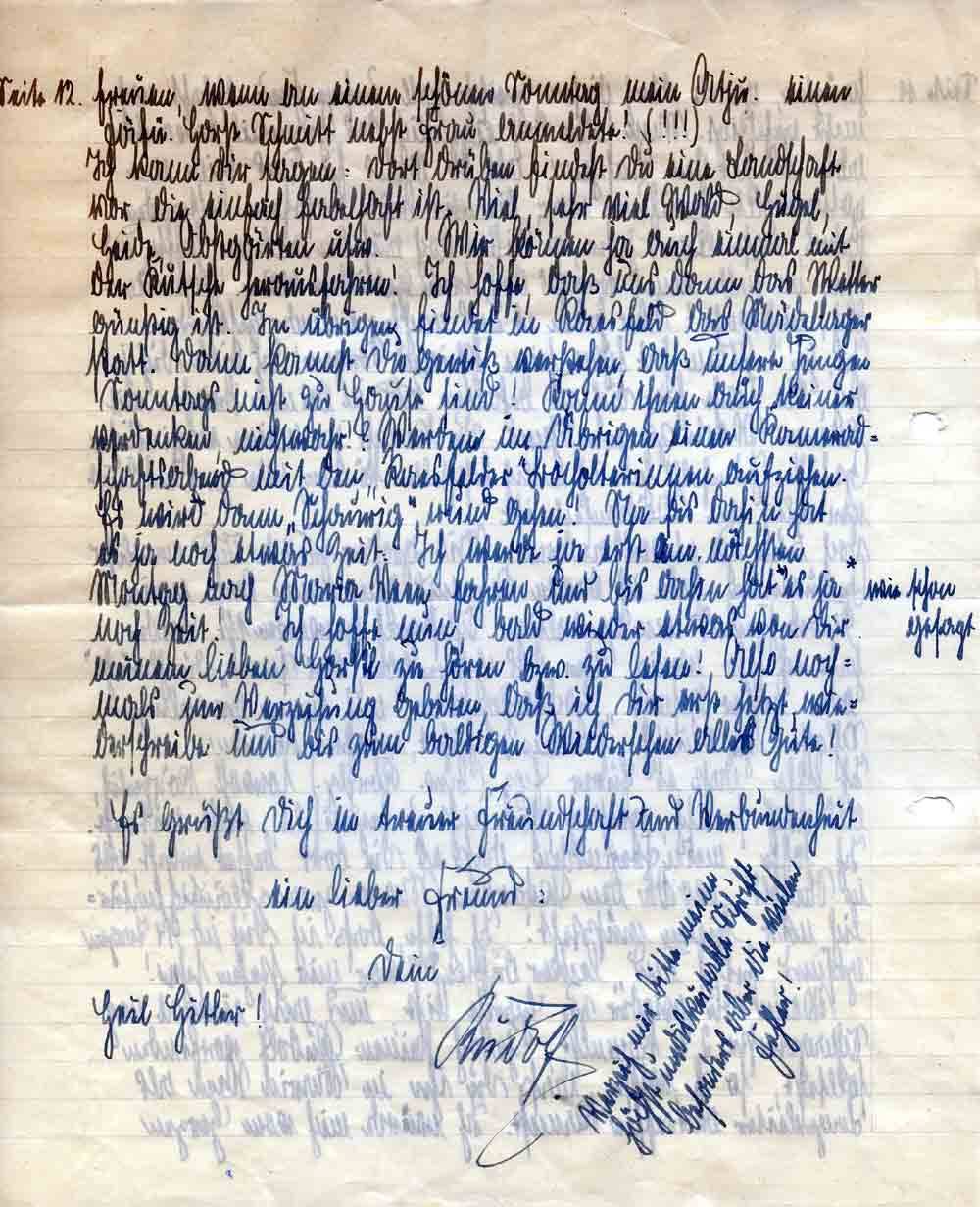Ich hoffe, daß es Eurer Exz. (bzw. Korplz.) sowohl körperlich, als auch seelisch, geistig schon nicht zu bezweifeln, recht gut geht. Ich hoffe, mein Freundchen, daß es Dir dort besser ergeht, als in Nagold, wo Du den kranken Mann, zwangsläufig natürlich nur, spielen mußtest! Ich hoffe, daß ich Dich in 14 Tagen gesund, frisch und „lecker duftend“ vor mir stehen sehe!