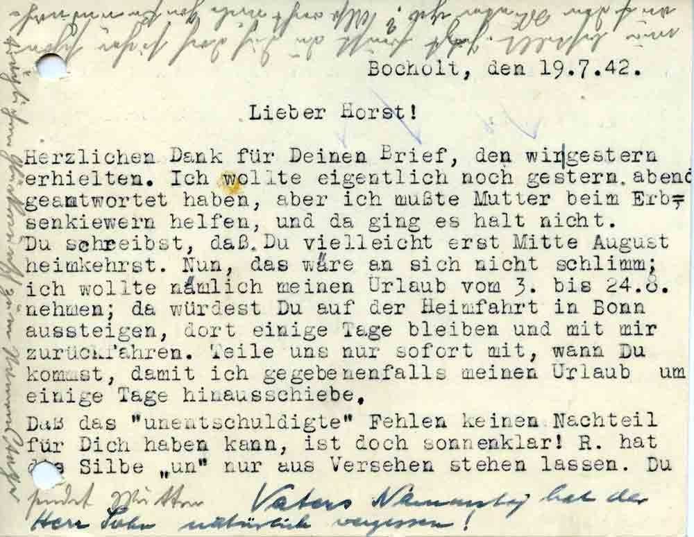 Du schreibst, daß Du vielleicht erst Mitte August heimkehrst. Nun, das wäre an sich nicht schlimm; ich wollte nämlich meinen Urlaub vom 3. bis 24.8. nehmen; da würdest Du auf der Heimfahrt in Bonn aussteigen, dort einige Tage bleiben und mit mir zurückfahren. Teile uns nur sofort mit, wann Du kommst, damit ich gegebenenfalls meinen Urlaub um einige Tage hinausschiebe.