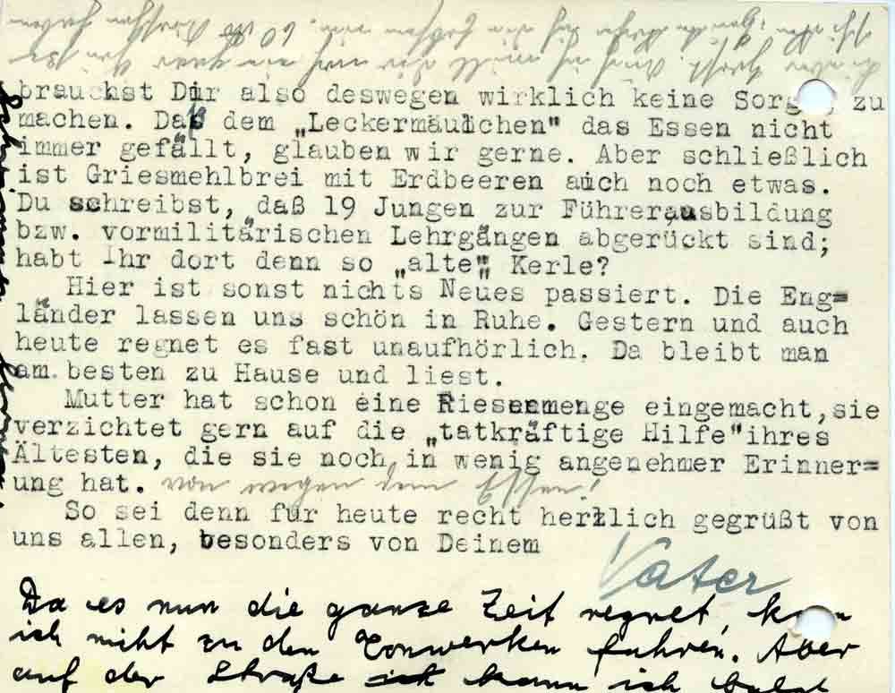 brauchst Dir also deswegen wirklich keine Sorgen zu machen. Daß dem „Leckermäulchen“ das Essen nicht immer gefällt, glauben wir gerne. Aber schließlich ist Griesmehlbrei mit Erdbeeren auch noch etwas. Du schreibst, daß 19 Jungen zur Führerausbildung bzw. vormilitärischen Lehrgängen abgerückt sind; habt Ihr dort denn so „alte“ Kerle?