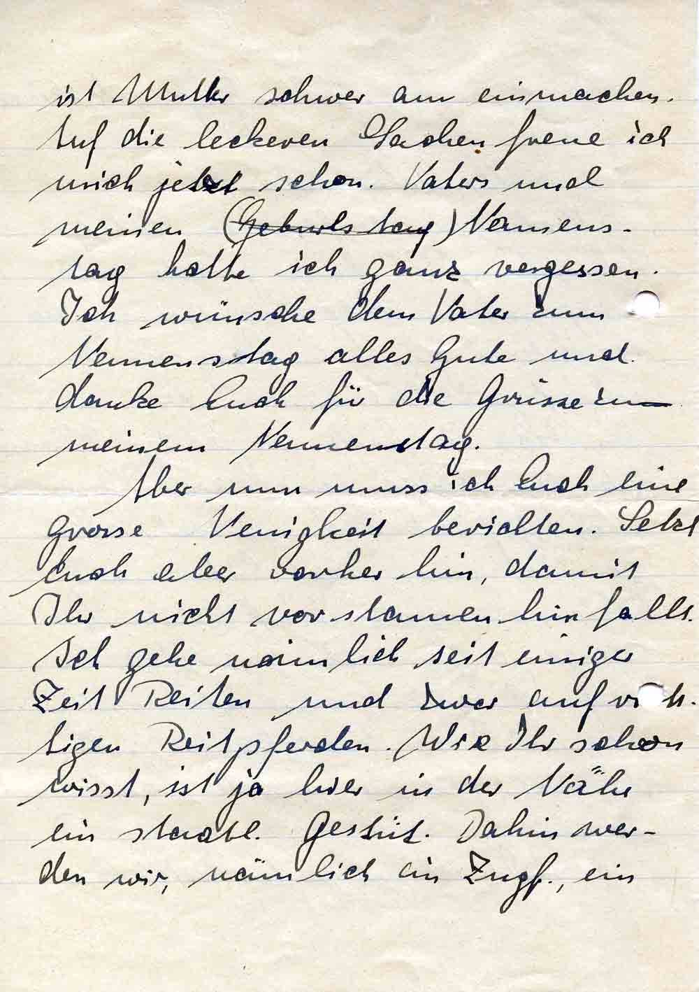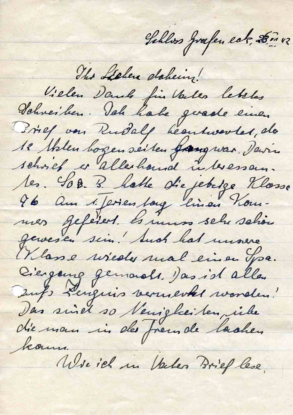 Vielen Dank für Vaters letztes Schreiben. Ich habe gerade einen Brief von Rudolf beantwortet, der 12 Aktenbogenseiten lang war. Darin schrieb er allerhand interessantes. So z. B. hatte die jetzige Klasse 7 b am 1. Ferientag einen Kommers gefeiert. Es muss sehr schön gewesen sein! Auch hat unsere Klasse wieder mal einen Spaziergang gemacht. Das ist allen aufs Zeugnis vermerkt worden! Das sind so Neuigkeiten, über die man in der Fremde lachen kann.