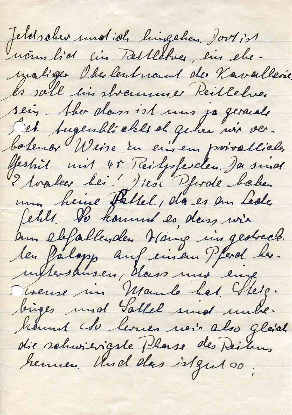 Feldscher und ich hingehen. Dort ist nämlich ein Reitlehrer, ein ehemaliger Oberleutnant der Kavallerie. Es soll ein strammer Reitlehrer sein. Aber dass ist uns ja gerade lieb. Augenblicklich gehen wir verbotener Weise in einem privatlichen Gestüt mit 45 Reitpferden. Da sind 2 Araber bei! Diese Pferde haben nun keine Sattel, da es am Leder fehlt. So kommt es, dass wir am abfallenden Hang im gestreckten Galopp auf einem Pferd heruntersausen, dass nur eine Trense im Maule hat. Steigbügel und Sattel sind unbekannt. So lernen wir also gleich die schwierigste Phase des Reitens kennen. Und das ist gut so;