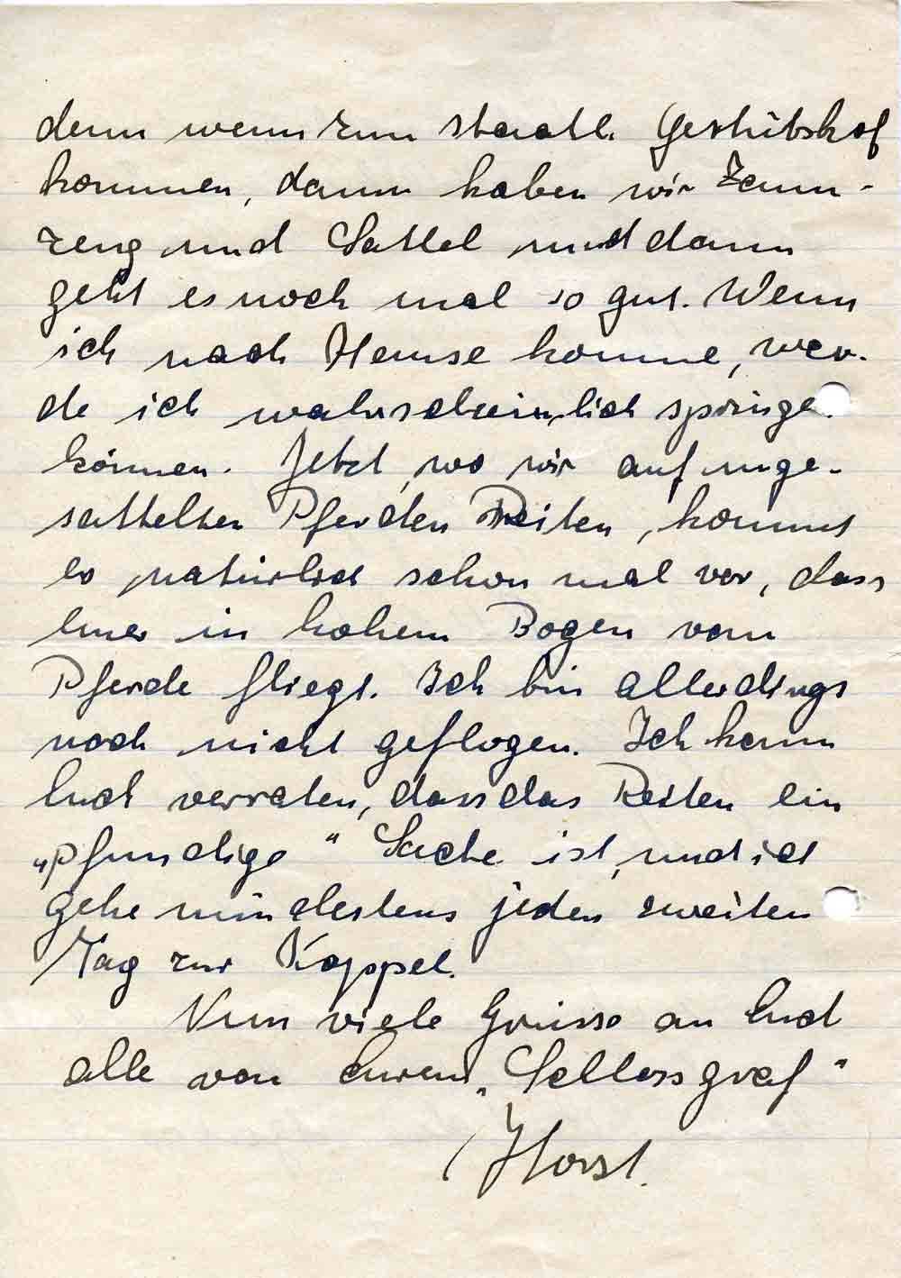 denn wenn zum staatl. Gestütshof kommen, dann haben wir Zaumzeug und Sattel und dann geht es noch mal so gut. Wenn ich nach Hause komme, werde ich wahrscheinlich springen können. Jetzt, wo wir auf ungesattelten Pferden reiten, kommt es natürlich schon mal vor, dass einer in hohem Bogen vom Pferde fliegt. Ich bin allerdings noch nicht geflogen. Ich kann Euch verraten, dass das Reiten ein „pfundige“ Sache ist, und ich gehe mindestens jeden zweiten Tag zur Koppel.