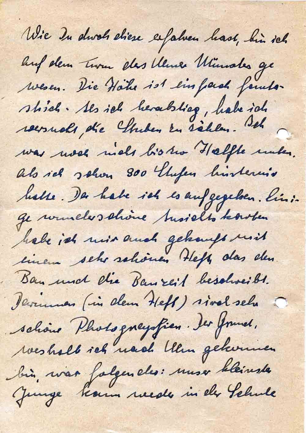 Wie Du durch diese erfahren hast, bin ich auf dem Turm des Ulmer Münsters gewesen. Die Höhe ist einfach fantastisch. Als ich herabstieg, habe ich versucht, die Stufen zu zählen. Ich war noch nicht bis zur Hälfte unten, als ich schon 300 Stufen hinter mir hatte. Da habe ich es aufgegeben. Einige wunderschöne Ansichtskarten habe ich mir auch gekauft mit einem sehr schönen Heft, das den Bau und die Bauzeit beschreibt. Darinnen (in dem Heft) sind sehr schöne Photographien. Der Grund, weshalb ich nach Ulm gekommen bin, war folgender: unser kleinster Junge kann weder in der Schule