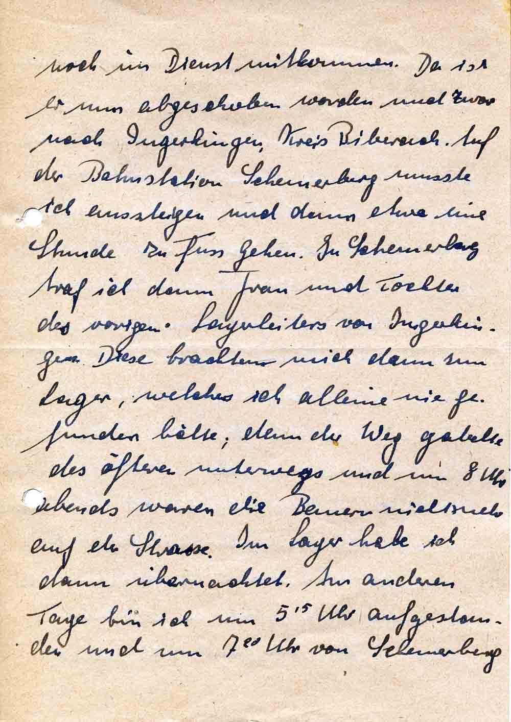 noch im Dienst mitkommen. Da ist er nun abgeschoben worden und zwar nach Ingerkingen, Kreis Biberach. Auf der Bahnstation Schemerberg musste ich aussteigen und dann etwa eine Stunde zu Fuss gehen. In Schemerberg traf ich dann Frau und Tochter des vorigen Lagerleiters von Ingerkingen. Diese brachten mich dann zum Lager, welches ich alleine nie gefunden hätte; denn der Weg gabelte des öfteren unterwegs und um 8 Uhr abends waren die Bauern nicht mehr auf der Strasse. Im Lager habe ich dann übernachtet. Am anderen Tage bin ich um 5.15 Uhr aufgestanden und um 7.20 Uhr von Schemerberg