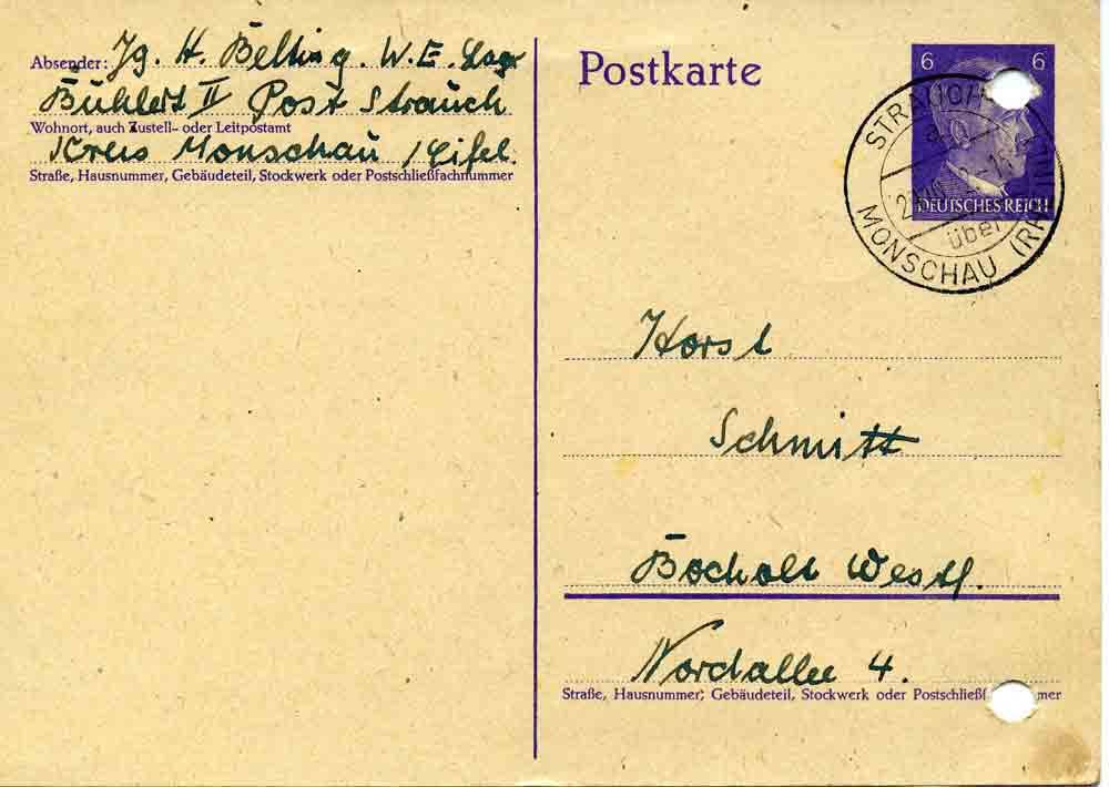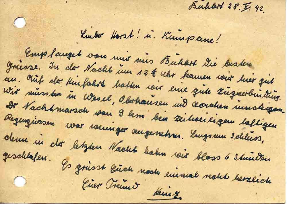 Empfangt von mir aus Buhlert die besten Grüsse. In der Nacht um 12 ½ Uhr kamen wir hier gut an. Auf der Hinfahrt hatten wir eine gute Zugverbindung. Wir mussten in Wesel, Oberhausen und Aachen umsteigen. Der Nachtmarsch von 9 km bei zeitweiligem heftigen Regengüssen war weniger angenehm. Langsam Schluss, denn in der letzten Nacht haben wir bloss 6 Stunden geschlafen.
