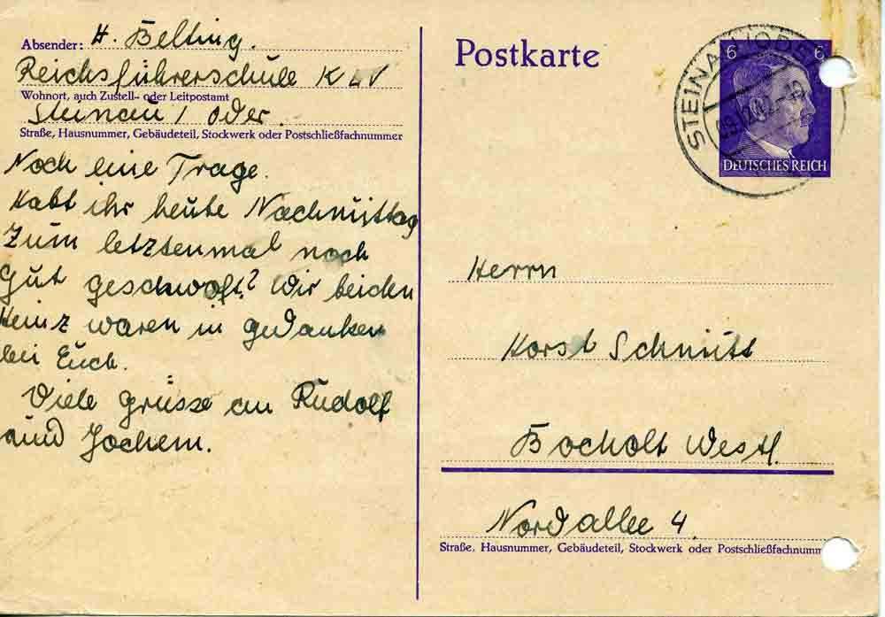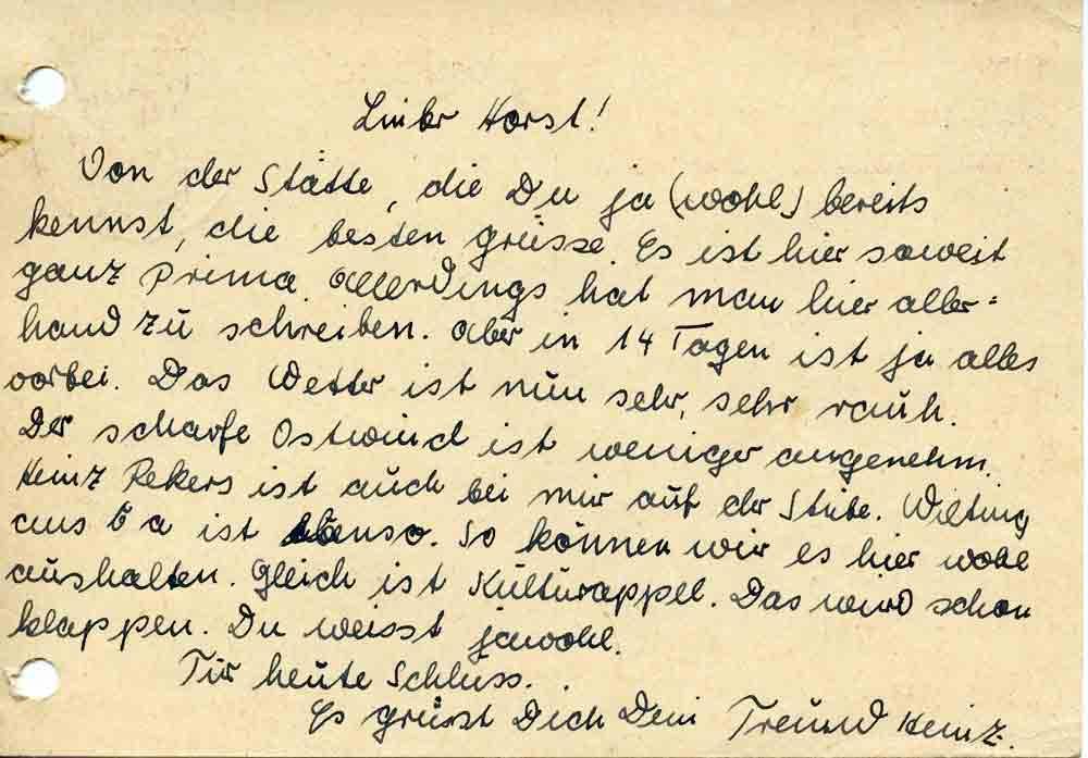 Von der Stätte, die Du ja (wohl) bereits kennst, die besten Grüsse. Es ist hier soweit ganz prima. Allerdings hat man hier allerhand zu schreiben. Aber in 14 Tagen ist ja alles vorbei. Das Wetter ist nun sehr, sehr rauh. Der scharfe Ostwind ist weniger angenehm. Heinz Rekers ist auch bei mir auf der Stube. Wilting aus 6 a ist ebenso. So können wir es hier wohl aushalten. Gleich ist Kulturappel. Das wird schon klappen. Du weisst jawohl.