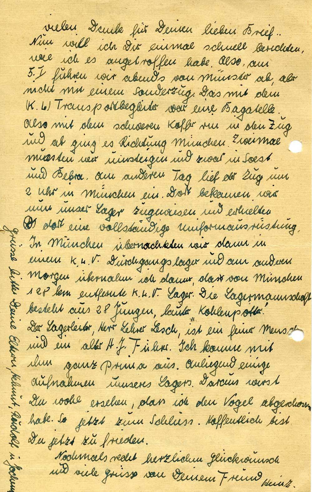 vielen Dank für Deinen lieben Brief. Nun will ich Dir einmal schnell berichten, wie ich es angetroffen habe. Also, am 5.I. fuhren wir abends von Münster ab, aber nicht mit einem Sonderzug. Das mit dem (K.L.) Transportbegleiter war eine Bagatelle. Also mit dem schweren Koffer rin in den Zug und ab ging es Richtung München. Zweimal mussten wir umsteigen und zwar in Soest und Bebra. Am anderen Tag lief der Zug um 2 Uhr in München ein. Dort bekamen wir nun unser Lager zugewiesen und erhielten dort eine vollständige Uniformausrüstung. In München übernachteten wir dann in einem K.L.V. Durchgangslager und am anderen Morgen übernahm ich dann, das von München 128 km entfernte K.L.V. Lager. Die Lagermannschaft besteht aus 28 Jungen, lauter „Kohlenpotter“. Der Lagerleiter, Herr Lehrer Lesch, ist ein feiner Mensch und ein alter H.J. Führer. Ich komme mit ihm ganz prima aus. Anliegend einige Aufnahmen unseres Lagers. Daraus wirst Du wohl ersehen, dass ich den Vogel abgeschossen habe. So jetzt zum Schluss. Hoffentlich bist Du jetzt zufrieden.