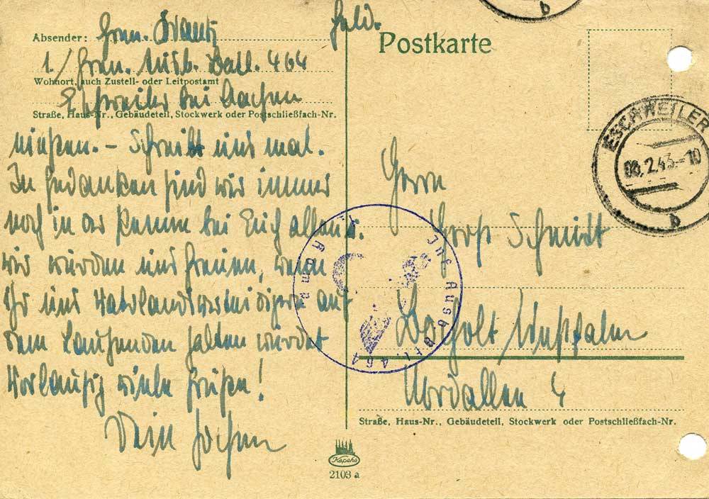 Jawohl! Grenadier Kraatz. Es lebe die Infanterie!?! Nach einem denkwürdigen Transport, über dessen nähere Einzelheiten in Friedenstraße 14 einiges erfahren werden kann, sind wir, das heißt Rudolf u. ich in Eschweiler bei der Infanterie gelandet. Vorläufig hatten wir noch keinen nennenswerten Dienst außer der Einkleidung, nach welcher wir nun aussehen wie ganz alte kampferprobte Landser. Morgen aber wird der Dienst wohl anfangen. Wenn mal erst die ersten 3 Wochen vorbei sind, dann wird es schon klappen u. wir werden die Freiheit eines Stadturlaubs wohl ge-