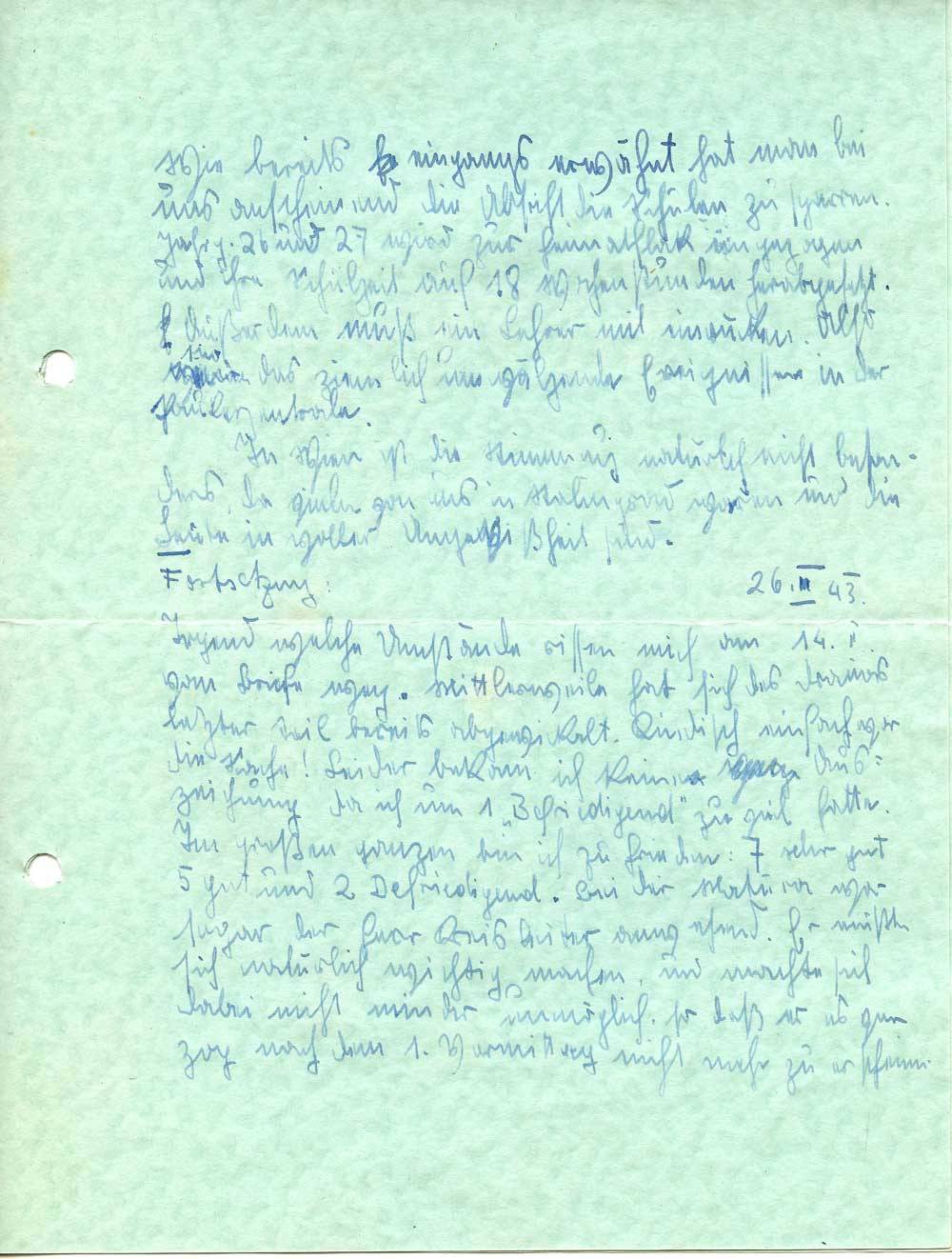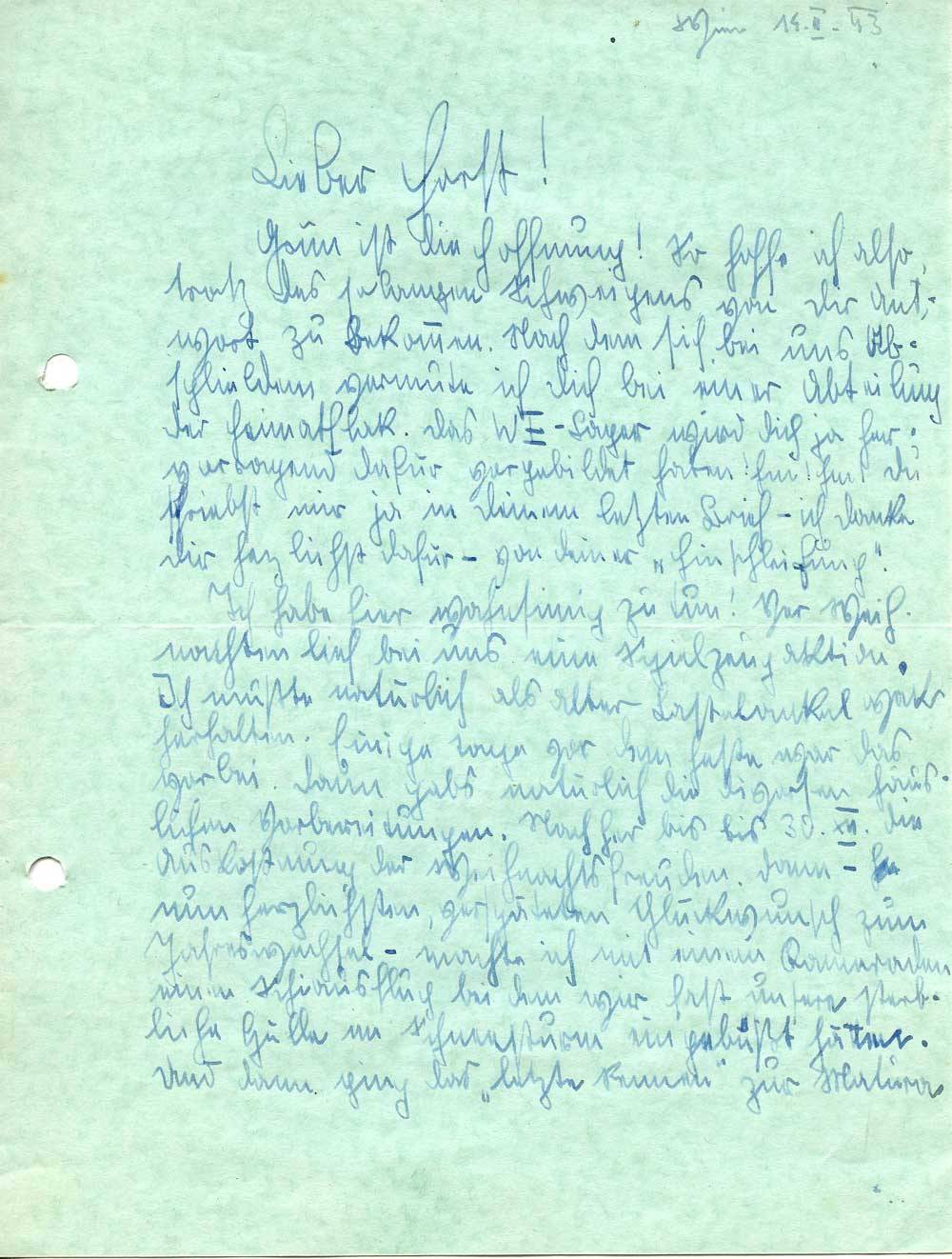 Grün ist die Hoffnung! So hoffe ich also, trotz des so langen Schweigens von Dir Antwort zu bekommen. Nach dem sich bei uns [?] vermute ich Dich bei einer Abteilung der Heimatflak. Das WE-Lager wird Dich ja hervorragend dafür vorgebildet haben: Hm! Hm! Du schriebst mir ja in Deinem letzten Brief – ich danke Dir herzlichst dafür – von Deiner „Einschleifung“.