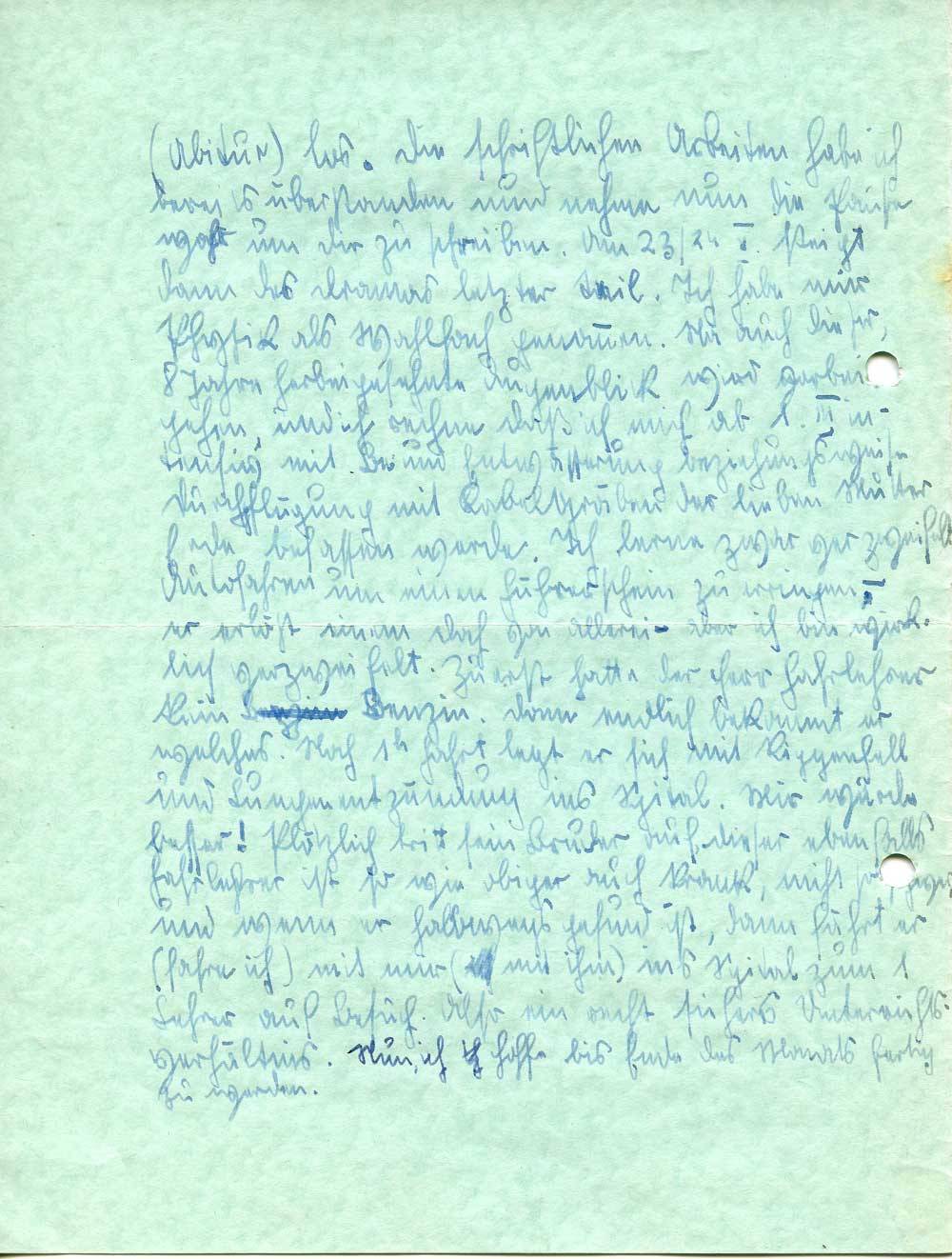 (Abitur) los. Die schriftlichen Arbeiten habe ich bereits überstanden und nehme nun die Pause wahr um Dir zu schreiben. Am 23/24.II. steigt dann des Dramas letzter Teil. Ich habe mir Physik als Wahlfach genommen. Na auch dieser, 8 Jahre herbeigesehnte Augenblick wird vorbeigehen, und ich rechne daß ich mich ab 1.III. intensiv mit Be- und Entwässerung beziehungsweise Durchpflügung mit Kabelgräben der lieben Mutter Erde befassen werde. Ich lerne zwar verzweifelt Autofahren um einen Führerschein zu erringen – er erlöst einem doch von allerlei – aber ich bin wirklich verzweifelt. Zuerst hatte der Herr Fahrlehrer kein Benzin. Dann endlich bekommt er welches. Nach 1 h Fahrt legt er sich mit Rippenfell- und Lungenentzündung ins Spital. Mir wurde besser! Plötzlich tritt sein Bruder auf, dieser ebenfalls Fahrlehrer ist so wie obiger auch krank, nicht so[?] und wenn er halbwegs gesund ist, dann fährt er (fahre ich) mit mir (mit ihm) ins Spital zum 1. Lehrer auf Besuch. Also ein recht sicheres Unterrichtsverhältnis. Nun, ich hoffe bis Ende des Monats fertig zu werden.