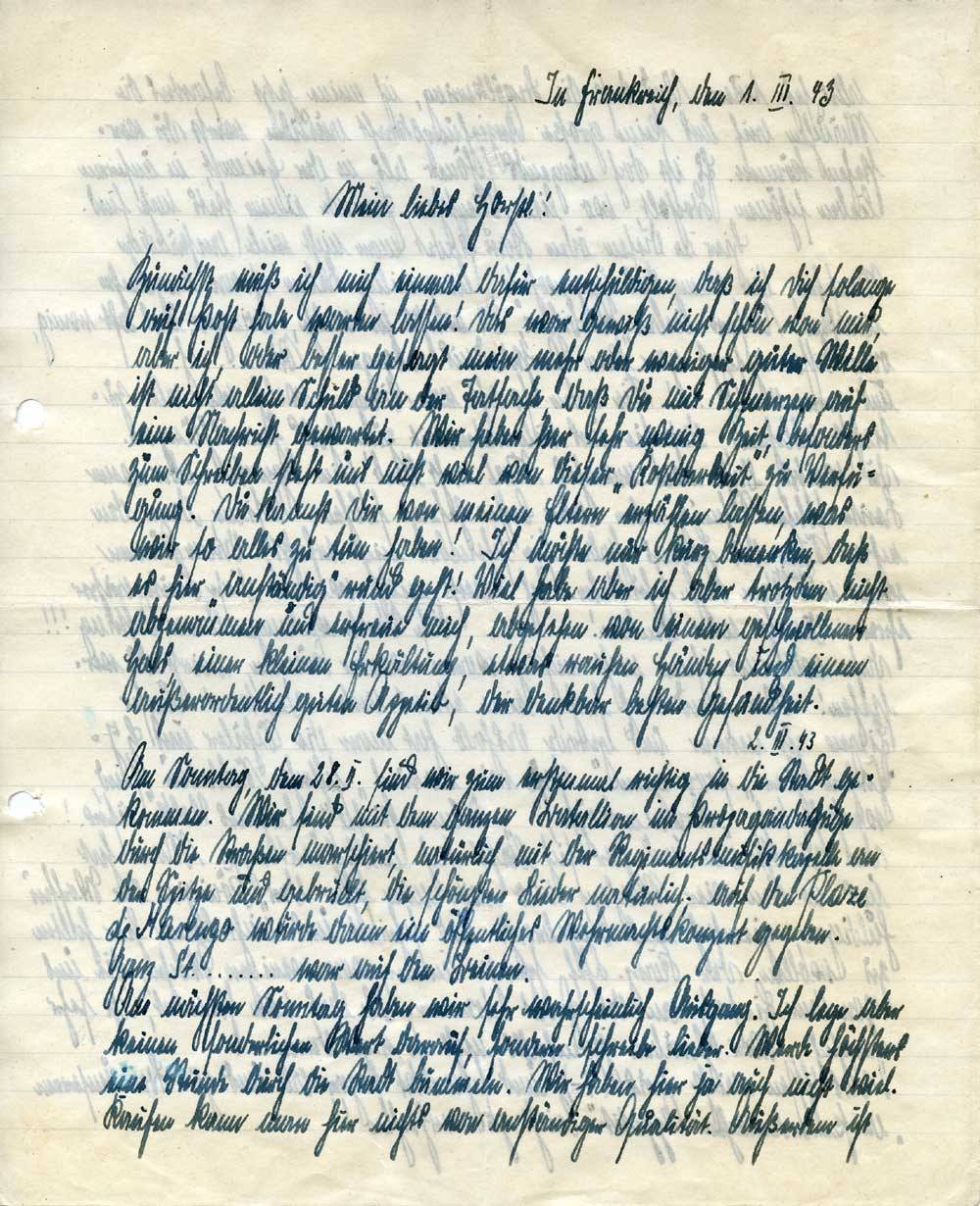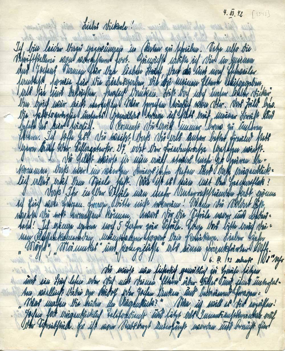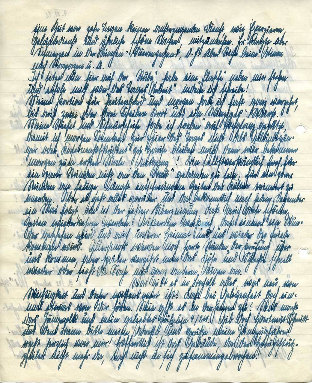 Ich bin leider dazu gezwungen in Raten zu schreiben. Setze also die Schriftstellerei von vorgestern fort. Zunächst möchte ich Dir in meinem und Jochens Namen für den lieben Brief, den Du uns nach Eschweiler sandtest, sowie für die Liebesgaben, die Du meinen Eltern mitgegeben, als sie uns besuchten, herzlich danken. Bist doch noch unser lieber „Dicker“, den auch wir nicht vergessen. Wir sprechen täglich von Dir. Das Bild bzw. die Photographie unseres [?] trage ich stets auf meiner Brust und besehe es mir täglich. Kommst Du auch immer brav zu unseren Eltern. Ich hoffe es! Du weißt, daß Du als unser bester Freund stets gern auf der Schlageterstr. 27 oder der Friedenstraße gesehen wirst.
