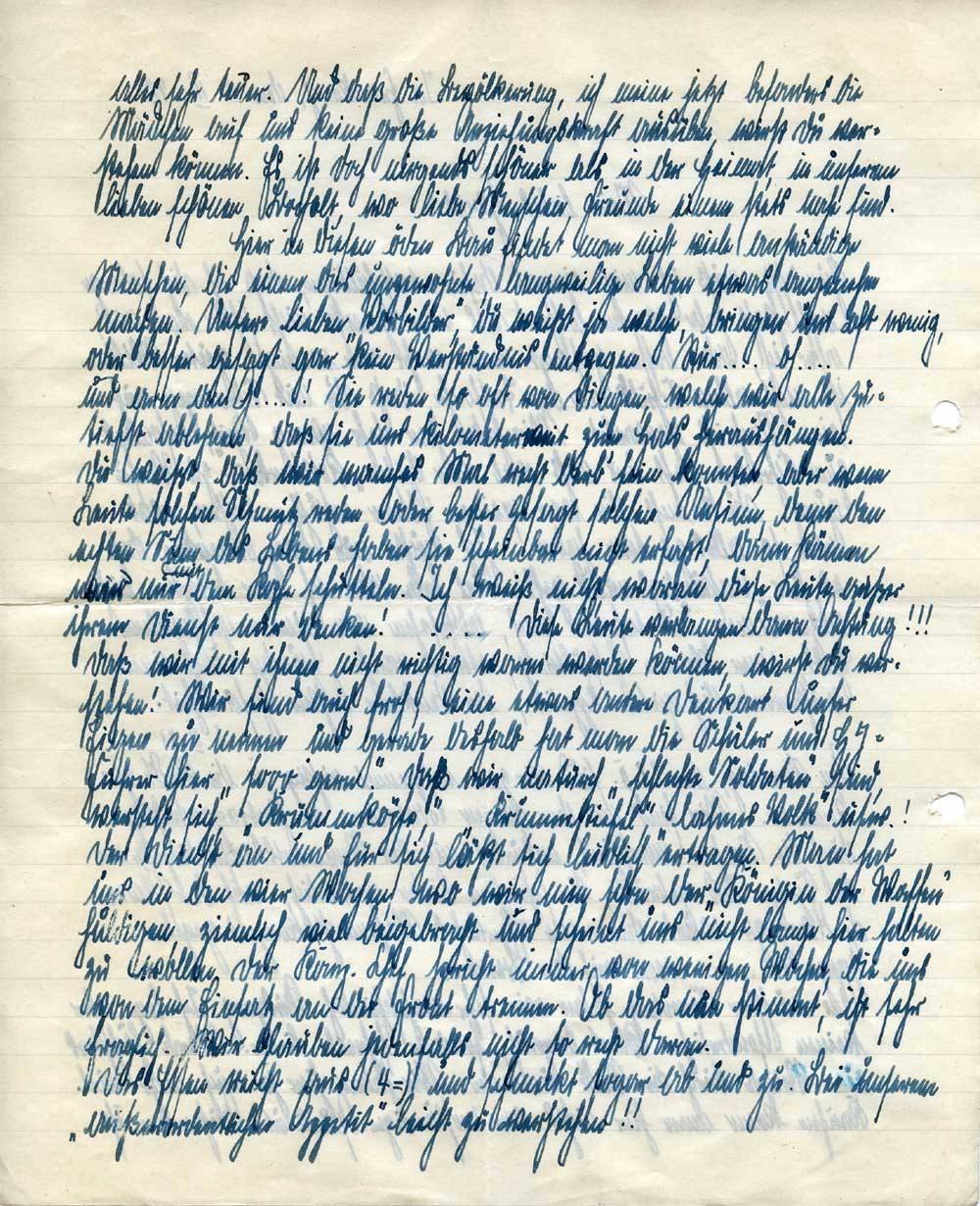 Hier in diesem öden Bau findet man nicht viele anständige Menschen, die einem das ungewohnte, langweilige Leben etwas angenehm machen. Unsere lieben „Vorbilder“, Du weißt ja welche, bringen uns oft wenig, oder besser gesagt gar kein Verständnis entgegen. Stur.... oh..... und arm von G.....! Sie reden so oft von Dingen, welche wir alle zutiefst ablehnen, daß sie uns kilometerweit zum Hals heraushängen. Du weißt, daß wir manches Mal recht derb‘ sein konnten, aber wenn Leute solchen Schmutz reden oder besser gesagt solchen Unsinn, denn den echten Sinn des Lebens haben sie scheinbar nicht erfaßt, dann können wir nur mit dem Kopfe schütteln. Ich weiß nicht, woran diese Leute außer ihrem Dienst nur denken! .... Diese Leute verlangen dann Achtung!!! Daß wir mit ihnen nicht richtig warm werden können, wirst Du verstehen! Wir sind auch froh, eine etwas andere Denkart unser Eigen zu nennen und gerade deshalb hat man die Schüler und HJ-Führer hier „sooo gern“. Daß wir natürlich „schlechte Soldaten“ sind, versteht sich, „Krummköpfe“, „Krummstiefel“, „lahmes Volk“ usw.! Der Dienst an und für sich läßt sich leidlich ertragen. Man hat uns in den vier Wochen, wo wir nun schon der „Königin der Waffen“ huldigen, ziemlich viel beigebracht und scheint uns nicht lange hier halten zu wollen. Der Komp.Chef spricht immer von wenigen Wochen, die uns von dem Einsatz an der Front trennen. Ob das nun stimmt, ist sehr fraglich. Wir glauben jedenfalls nicht so recht daran.