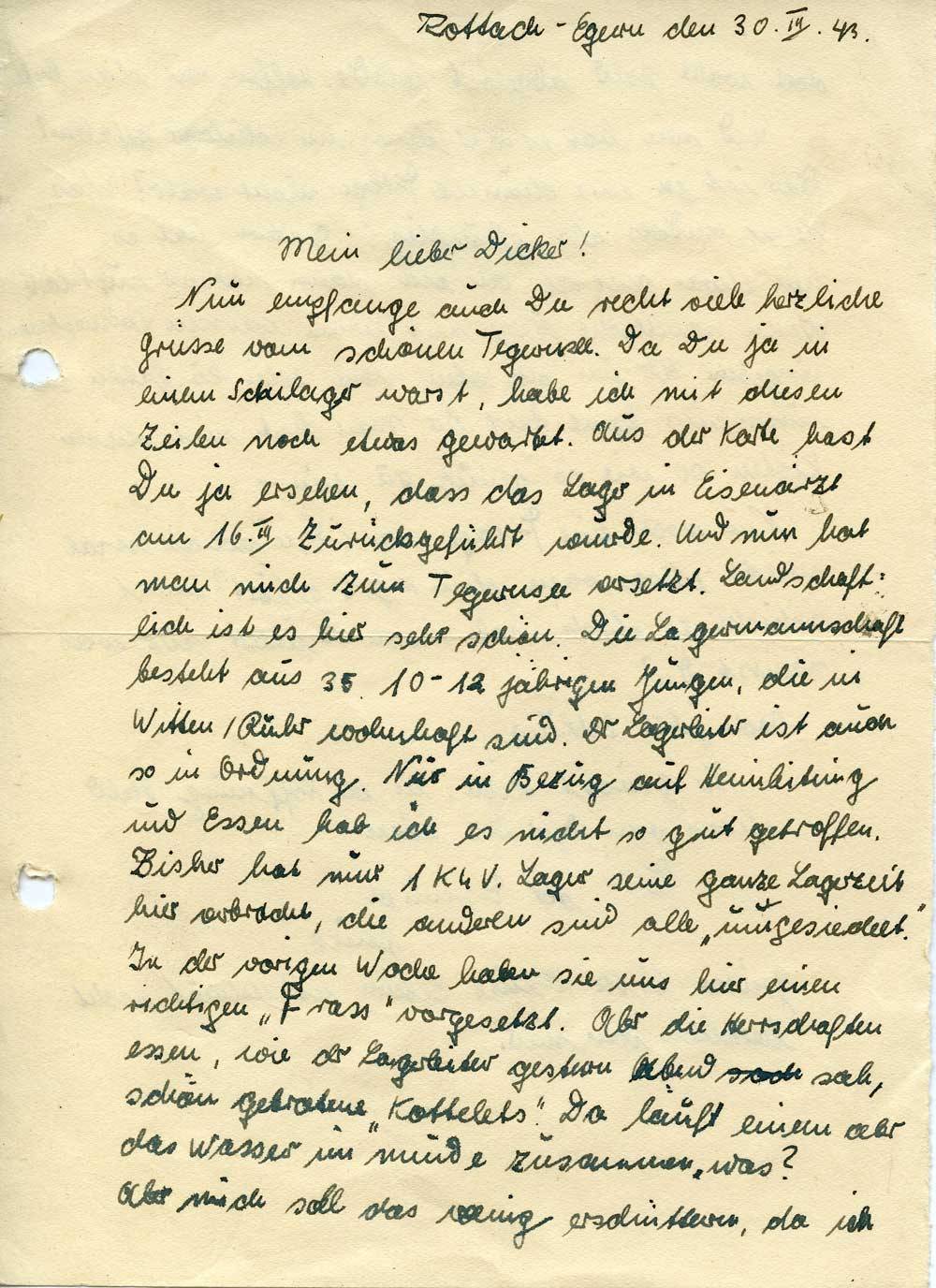 Nun empfange auch Du recht viele herzliche Grüsse vom schönen Tegernsee. Da Du ja in einem Schilager warst, habe ich mit diesen Zeilen noch etwas gewartet. Aus der Karte hast Du ja ersehen, dass das Lager in Eisenärzt am 16.III. zurückgeführt wurde. Und nun hat man mich zum Tegernsee versetzt. Landschaftlich ist es hier sehr schön. Die Lagermannschaft besteht aus 35 10-12 jährigen Jungen, die in Witten/Ruhr wohnhaft sind. Der Lagerleiter ist auch so in Ordnung. Nur in Bezug auf Heimleitung und Essen hab ich es nicht so gut getroffen. Bisher hat nur 1 KLV.Lager seine ganze Lagerzeit hier verbracht, die anderen sind alle „umgesiedelt“.