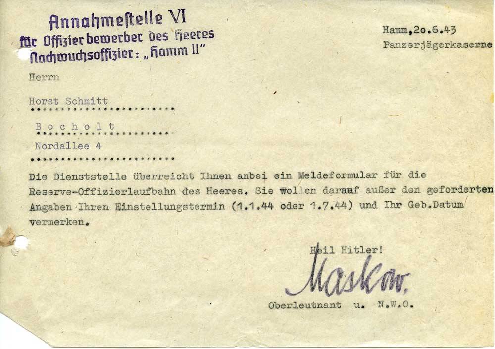 Annahmestelle für Offizierbewerber an Horst Schmitt, 20. Juni 1943