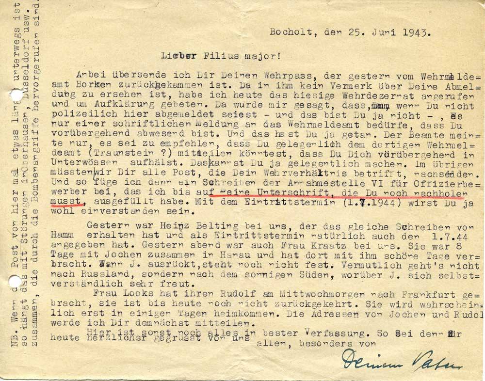 Anbei übersende ich Dir Deinen Wehrpass, der gestern vom Wehrmeldeamt Borken zurückgekommen ist. Da in ihm kein Vermerk über Deine Abmeldung zu ersehen ist, habe ich heute das hiesige Wehrdezernat angerufen und um Aufklärung gebeten. Da wurde mir gesagt, dass, wenn Du nicht polizeilich hier abgemeldet seiest – und das bist Du ja nicht -, es nur einer schriftlichen Meldung an das Wehrmeldeamt bedürfe, dass Du vorübergehend abwesend bist. Und das hast Du ja getan. Der Beamte meinte nur, es sei zu empfehlen, dass Du gelegentlich dem dortigen Wehrmeldeamt (Traunstein ?) mitteilen könntest, dass Du Dich vorübergehend in Unterwössen aufhälst. Das kannst Du ja gelegentlich machen. Im übrigen müssten wir Dir alle Post, die Dein Wehrverhältnis betrifft, nachsenden. Und so füge ich denn ein Schreiben der Annahmestelle VI für Offizierbewerber bei, das ich bis auf Deine Unterschrift, die Du noch nachholen musst, ausgefüllt habe. Mit dem Eintrittstermin (1.7.1944) wirst Du ja wohl einverstanden sein.