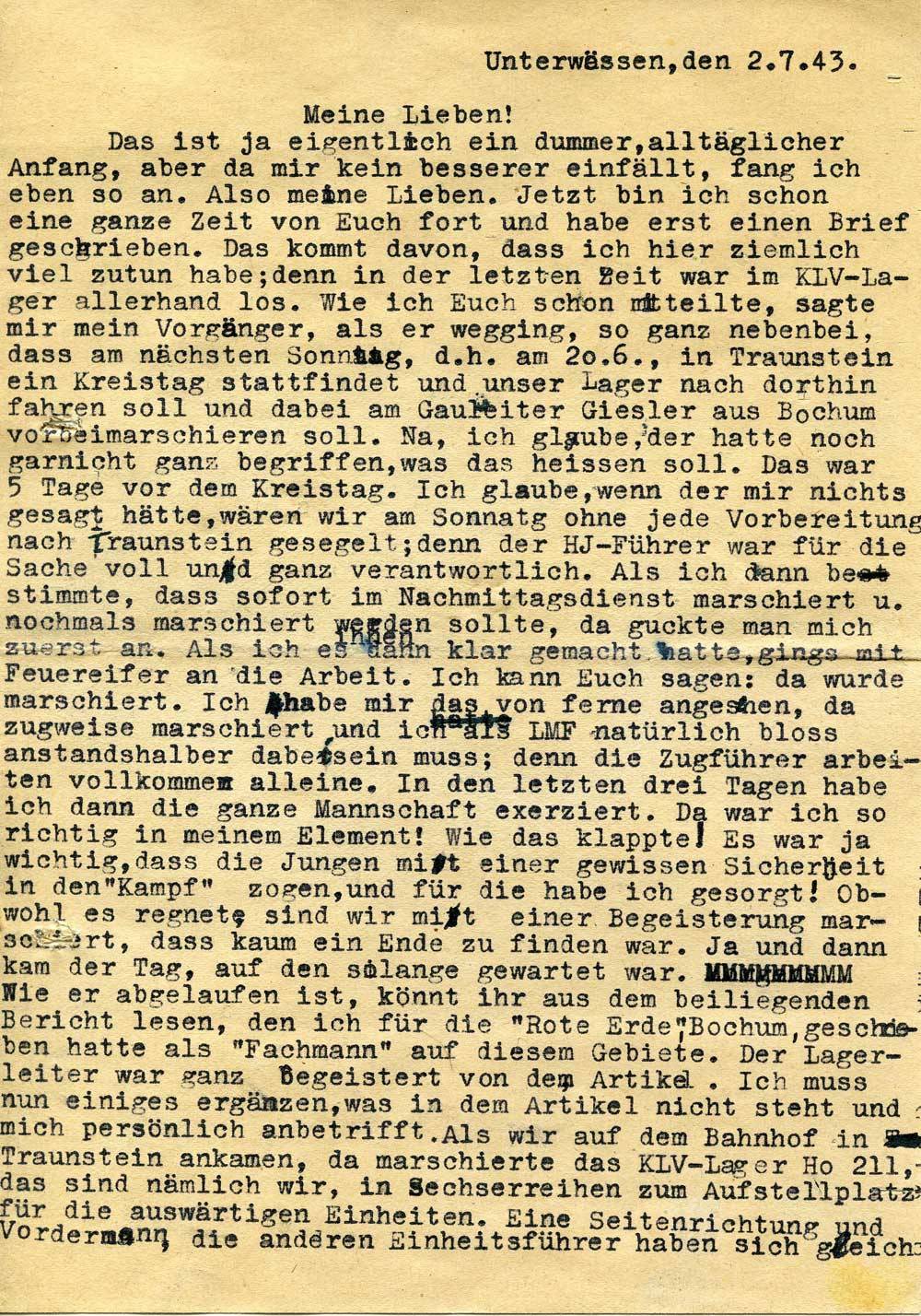 Das ist ja eigentlich ein dummer, alltäglicher Anfang, aber da mir kein besserer einfällt, fang ich eben so an. Also meine Lieben. Jetzt bin ich schon eine ganze Zeit von Euch fort und habe erst einen Brief geschrieben. Das kommt davon, dass ich hier ziemlich viel zutun habe; denn in der letzten Zeit war im KLV-Lager allerhand los. Wie ich Euch schon mitteilte, sagte mir mein Vorgänger, als er wegging, so ganz nebenbei, dass am nächsten Sonntag, d. h. am 20.6., in Traunstein ein Kreistag stattfindet und unser Lager nach dorthin fahren soll und dabei am Gauleiter Giesler aus Bochum vorbeimarschieren soll. Na, ich glaube, der hatte noch garnicht ganz begriffen, was das heissen soll. Das war 5 Tage vor dem Kreistag. Ich glaube, wenn der mir nichts gesagt hätte, wären wir am Sonntag ohne jede Vorbereitung nach Traunstein gesegelt; denn der HJ-Führer war für die Sache voll und ganz verantwortlich. Als ich dann bestimmte, dass sofort im Nachmittagsdienst marschiert u. nochmals marschiert werden sollte, da guckte man mich zuerst an. Als ich es ihnen dann klar gemacht hatte, gings mit Feuereifer an die Arbeit. Ich kann Euch sagen: da wurde marschiert. Ich habe mir das von ferne angesehen, da zugweise marschiert und ich als LMF natürlich bloss anstandshalber dabeisein muss; denn die Zugführer arbeiten vollkommen alleine. In den letzten drei Tagen habe ich dann die ganze Mannschaft exerziert. Da war ich so richtig in meinem Element! Wie das klappte! Es war ja wichtig, dass die Jungen mit einer gewissen Sicherheit in den „Kampf“ zogen, und für die habe ich gesorgt! Obwohl es regnete, sind wir mit einer Begeisterung marschiert, dass kaum ein Ende zu finden war. Ja und dann kam der Tag, auf den solange gewartet war. Wie er gelaufen ist, könnt ihr aus dem beiliegenden Bericht lesen, den ich für die „Rote Erde“, Bochum, geschrieben hatte als „Fachmann“ auf diesem Gebiete. Der Lagerleiter war ganz begeistert von dem Artikel. Ich muss nun einiges ergänzen, was in dem Artikel nicht steht und mich persönlich anbetrifft. Als wir auf dem Bahnhof in Traunstein ankamen, da marschierte das KLV-Lager Ho 211, das sind nämlich wir, in Sechserreihen zum Aufstellplatz für die auswärtigen Einheiten. Eine Seitenrichtung und Vordermann, die anderen Einheitsführer haben sich gleich