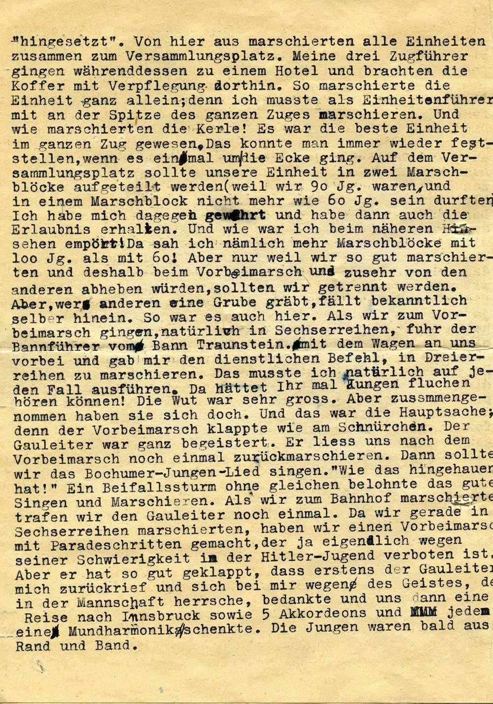„hingesetzt“. Von hier aus marschierten alle Einheiten zusammen zum Versammlungsplatz. Meine drei Zugführer gingen währenddessen zu einem Hotel und brachten die Koffer mit Verpflegung dorthin. So marschierte die Einheit ganz allein; denn ich musste als Einheitenführer mit an der Spitze des ganzen Zuges marschieren. Und wie marschierten die Kerle! Es war die beste Einheit im ganzen Zug gewesen. Das konnte man immer wieder feststellen, wenn es einmal um die Ecke ging. Auf dem Versammlungsplatz sollte unsere Einheit in zwei Marschblöcke aufgeteilt werden (weil wir 90 Jg. waren, und in einem Marschblock nicht mehr wie 60 Jg. sein durften). Ich habe mich dagegen gewehrt und habe dann auch die Erlaubnis erhalten. Und wie war ich beim näheren Hinsehen empört! Da sah ich nämlich mehr Marschblöcke mit 100 Jg. als mit 60! Aber nur weil wir so gut marschierten und deshalb beim Vorbeimarsch uns zusehr von den anderen abheben würden, sollten wir getrennt werden. Aber, wer anderen eine Grube gräbt, fällt bekanntlich selber hinein. So war es auch hier. Als wir zum Vorbeimarsch gingen, natürlich in Sechserreihen, fuhr der Bannführer vom Bann Traunstein mit dem Wagen an uns vorbei und gab mir den dienstlichen Befehl, in Dreierreihen zu marschieren. Das musste ich natürlich auf jeden Fall ausführen. Da hättet Ihr mal Jungen fluchen hören können! Die Wut war sehr gross. Aber zusammengenommen haben sie sich doch. Und das war die Hauptsache; denn der Vorbeimarsch klappte wie am Schnürchen. Der Gauleiter war ganz begeistert. Er liess uns nach dem Vorbeimarsch noch einmal zurückmarschieren. Dann sollten wir das Bochumer-Jungen-Lied singen. „Wie das hingehauen hat!“ Ein Beifallssturm ohne gleichen belohnte das gute Singen und Marschieren. Als wir zum Bahnhof marschierten trafen wir den Gauleiter noch einmal. Da wir gerade in Sechserreihen marschierten, haben wir einen Vorbeimarsch mit Paradeschritten gemacht, der ja eigentlich wegen seiner Schwierigkeit in der Hitler-Jugend verboten ist. Aber er hat so gut geklappt, dass erstens der Gauleiter mich zurückrief und sich bei mir wegen des Geistes, der in der Mannschaft herrsche, bedankte und uns dann eine Reise nach Innsbruck sowie 5 Akkordeons und jedem eine Mundharmonika schenkte. Die Jungen waren bald aus Rand und Band.