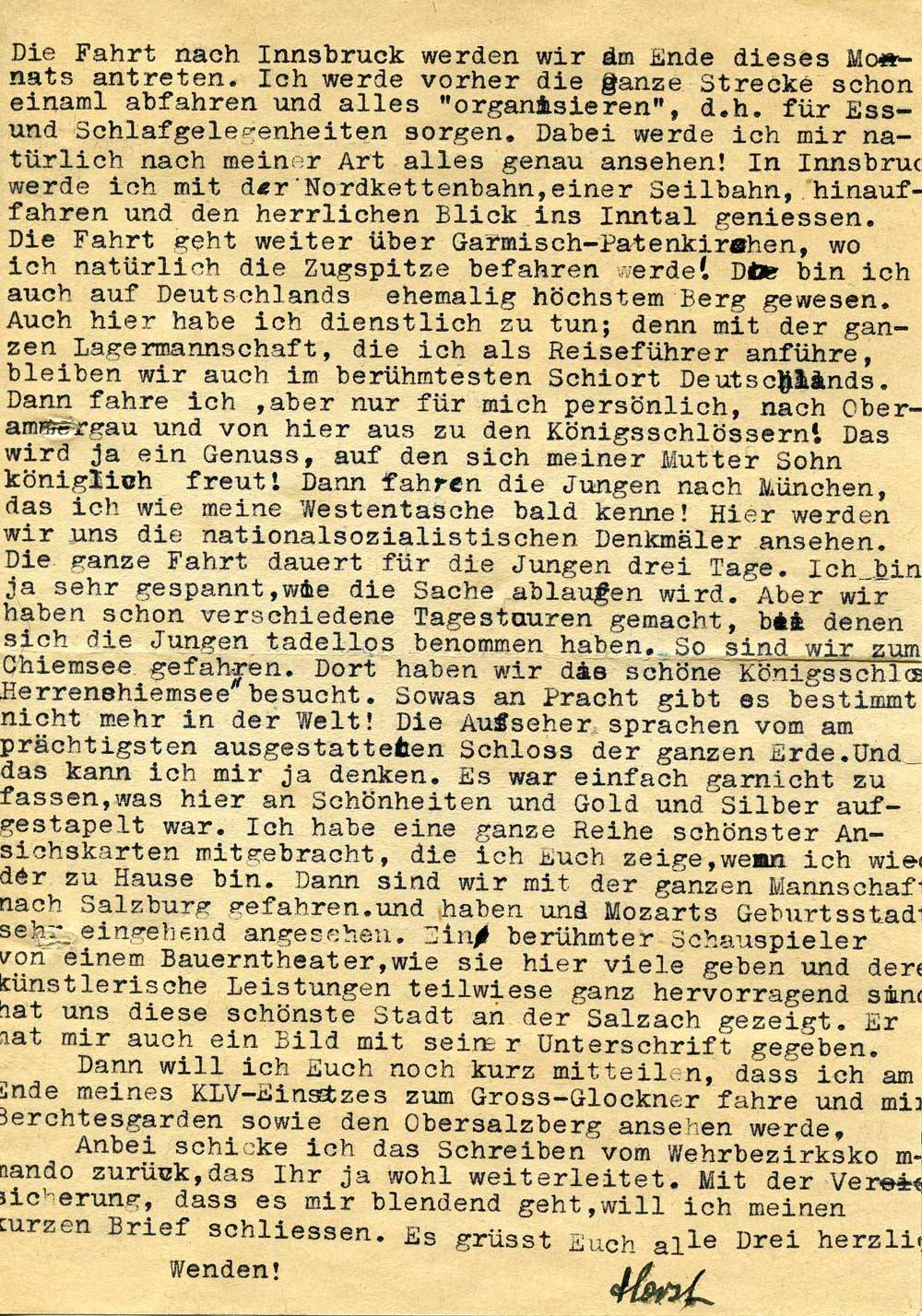 Die Fahrt nach Innsbruck werden wir am Ende dieses Monats antreten. Ich werde vorher die ganze Strecke schon einmal abfahren und alles „organisieren“, d. h. für Ess- und Schlafgelegenheiten sorgen. Dabei werde ich mir natürlich nach meiner Art alles genau ansehen! In Innsbruck werde ich mit der Nordkettenbahn, einer Seilbahn, hinauffahren und den herrlichen Blick ins Inntal geniessen. Die Fahrt geht weiter über Garmisch-Partenkirchen, wo ich natürlich die Zugspitze befahren werde! Da bin ich auch auf Deutschlands ehemalig höchstem Berg gewesen. Auch hier habe ich dienstlich zu tun; denn mit der ganzen Lagermannschaft, die ich als Reiseführer anführe, bleiben wir auch im berühmtesten Schiort Deutschlands. Dann fahre ich, aber nur für mich persönlich, nach Oberammergau und von hier aus zu den Königsschlössern! Das wird ja ein Genuss, auf den sich meiner Mutter Sohn königlich freut! Dann fahren die Jungen nach München, das ich wie meine Westentasche bald kenne! Hier werden wir uns die nationalsozialistischen Denkmäler ansehen. Die ganze Fahrt dauert für die Jungen drei Tage. Ich bin ja sehr gespannt, wie die Sache ablaufen wird. Aber wir haben schon verschiedene Tagestouren gemacht, bei denen sich die Jungen tadellos benommen haben. So sind wir zum Chiemsee gefahren. Dort haben wir das schöne Königsschloss Herrenchiemsee besucht. Sowas an Pracht gibt es bestimmt nicht mehr in der Welt! Die Aufseher sprachen vom am prächtigsten ausgestatteten Schloss der ganzen Erde. Und das kann ich mir ja denken. Es war einfach garnicht zu fassen, was hier an Schönheiten und Gold und Silber aufgestapelt war. Ich habe eine ganze Reihe schönster Ansichtskarten mitgebracht, die ich Euch zeige, wenn ich wieder zu Hause bin. Dann sind wir mit der ganzen Mannschaft nach Salzburg gefahren und haben uns Mozarts Geburtsstadt sehr eingehend angesehen. Ein berühmter Schauspieler von einem Bauerntheater, wie sie hier viele geben und deren künstlerische Leistungen teilweise ganz hervorragend sind, hat uns diese schönste Stadt an der Salzach gezeigt. Er hat mir auch ein Bild mit seiner Unterschrift gegeben.