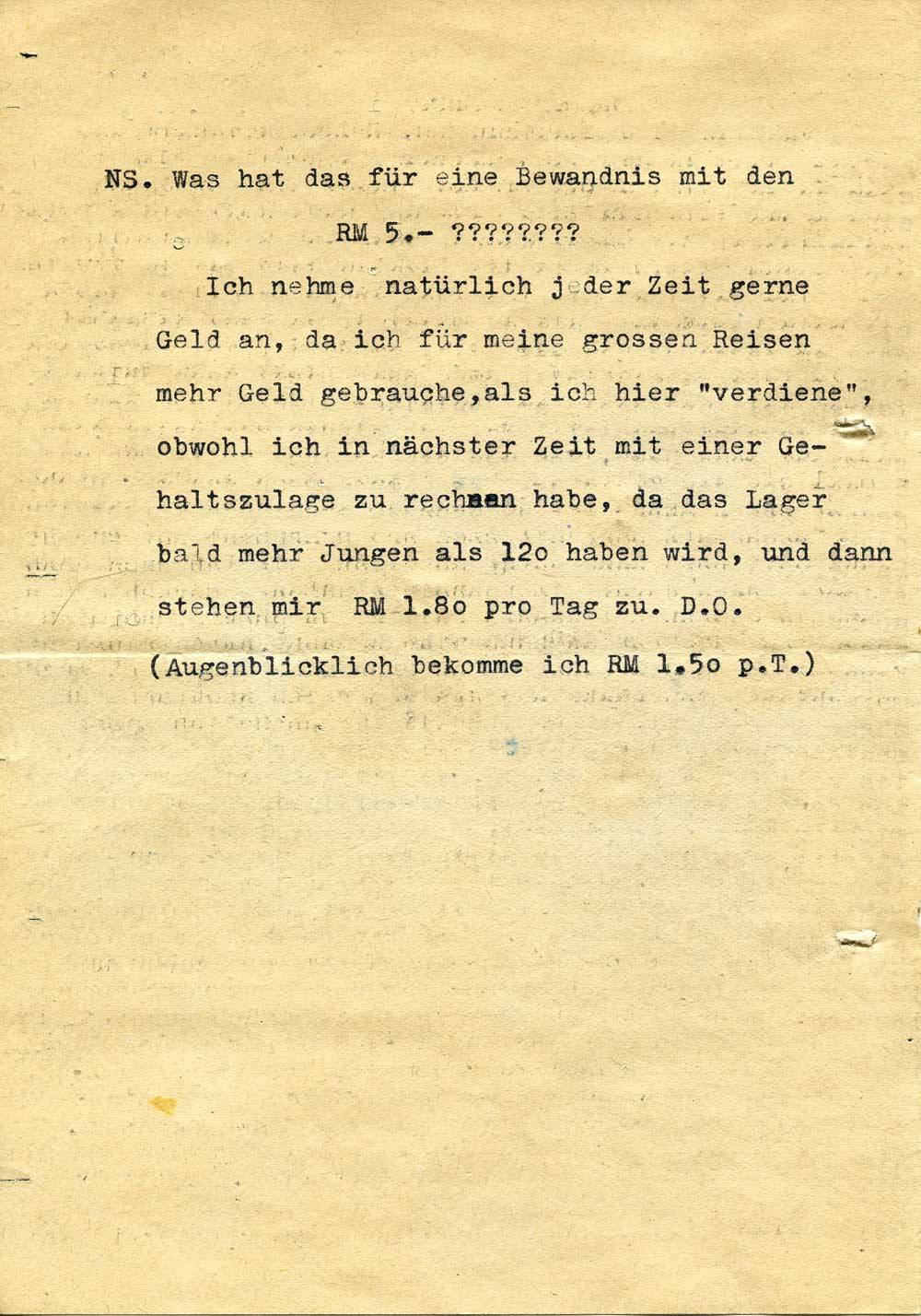 Ich nehme natürlich jeder Zeit gerne Geld an, da ich für meine grossen Reisen mehr Geld gebrauche, als ich hier „verdiene“, obwohl ich in nächster Zeit mit einer Gehaltszulage zu rechnen habe, da das Lager bald mehr Jungen als 120 haben wird, und dann stehen mir RM 1.80 pro Tag zu. D.O.