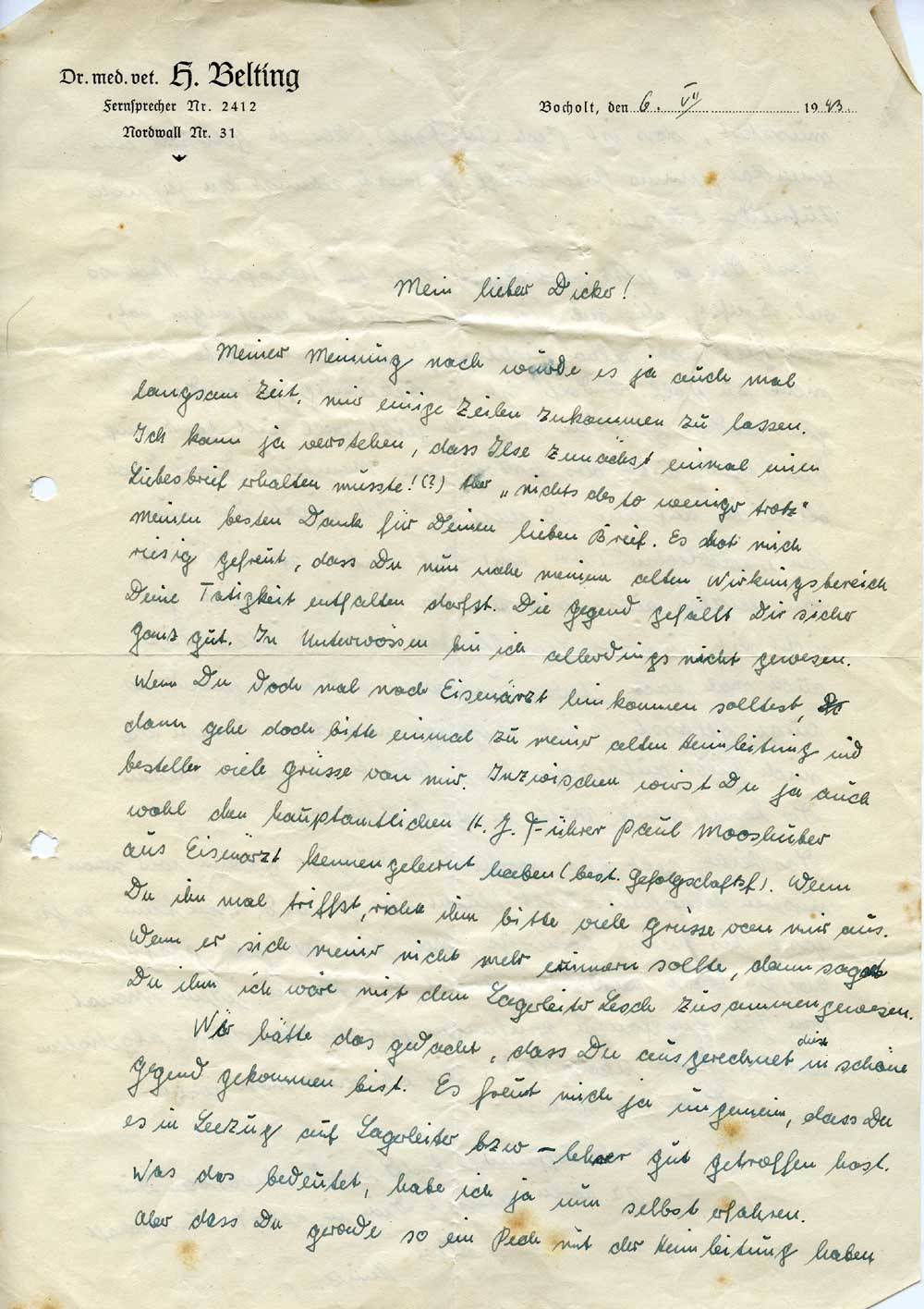 Meiner Meinung nach würde es ja auch mal langsam Zeit, mir einige Zeilen zukommen zu lassen. Ich kann ja verstehen, dass Ilse zunächst einmal einen Liebesbrief erhalten musste! (?) Aber „nichts desto weniger trotz“ meinen besten Dank für Deinen lieben Brief. Es hat mich riesig gefreut, dass Du nun nahe meinem alten Wirkungsbereich Deine Tätigkeit entfalten darfst. Die Gegend gefällt Dir sicher ganz gut. In Unterwössen bin ich allerdings nicht gewesen. Wenn Du doch mal nach Eisenärzt hinkommen solltest, dann gehe doch bitte einmal zu meiner alten Heimleitung und bestelle viele Grüsse von mir. Inzwischen wirst Du ja auch wohl den hauptamtlichen H.J. Führer Paul Mooshuber aus Eisenärzt kennengelernt haben (best. Gefolgschaftsf.). Wenn Du ihn mal triffst, richte ihm bitte viele Grüsse von mir aus. Wenn er sich meiner nicht mehr erinnern sollte, dann sagst Du ihm ich wäre mit dem Lagerleiter Lesch zusammengewesen.