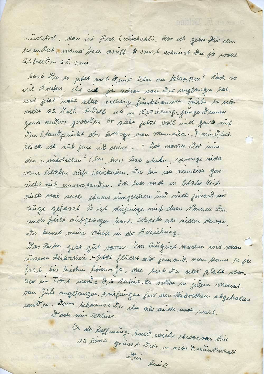Hast Du es jetzt mit Deiner Ilse am klappen? Nach so viel Briefen, die sie ja schon von Dir empfangen hat, wird jetzt wohl alles richtig funktionieren. Treibe es aber nicht zu doll. Rudolf ist in Beziehung „junge Damen“ ganz anders geworden. Er steht jetzt voll und ganz auf dem Standpunkt des Herzogs von Mantua: „Freundlich blick ich auf jene und diese ...“. Ich möchte Dir nun den „väterlichen“ (hm, hm) Rat erteilen, springe nicht vom Hölzchen aufs Stöckchen. Da bin ich nämlich gar nicht mit einverstanden. Ich habe mich in letzter Zeit auch mal nach etwas umgesehen und auch jemand ins Auge gefasst. Es ist diejenige mit deren Namen Du mich früher aufgezogen hast. Schreibe aber nichts davon, Du kennst meine Mutter in der Beziehung.