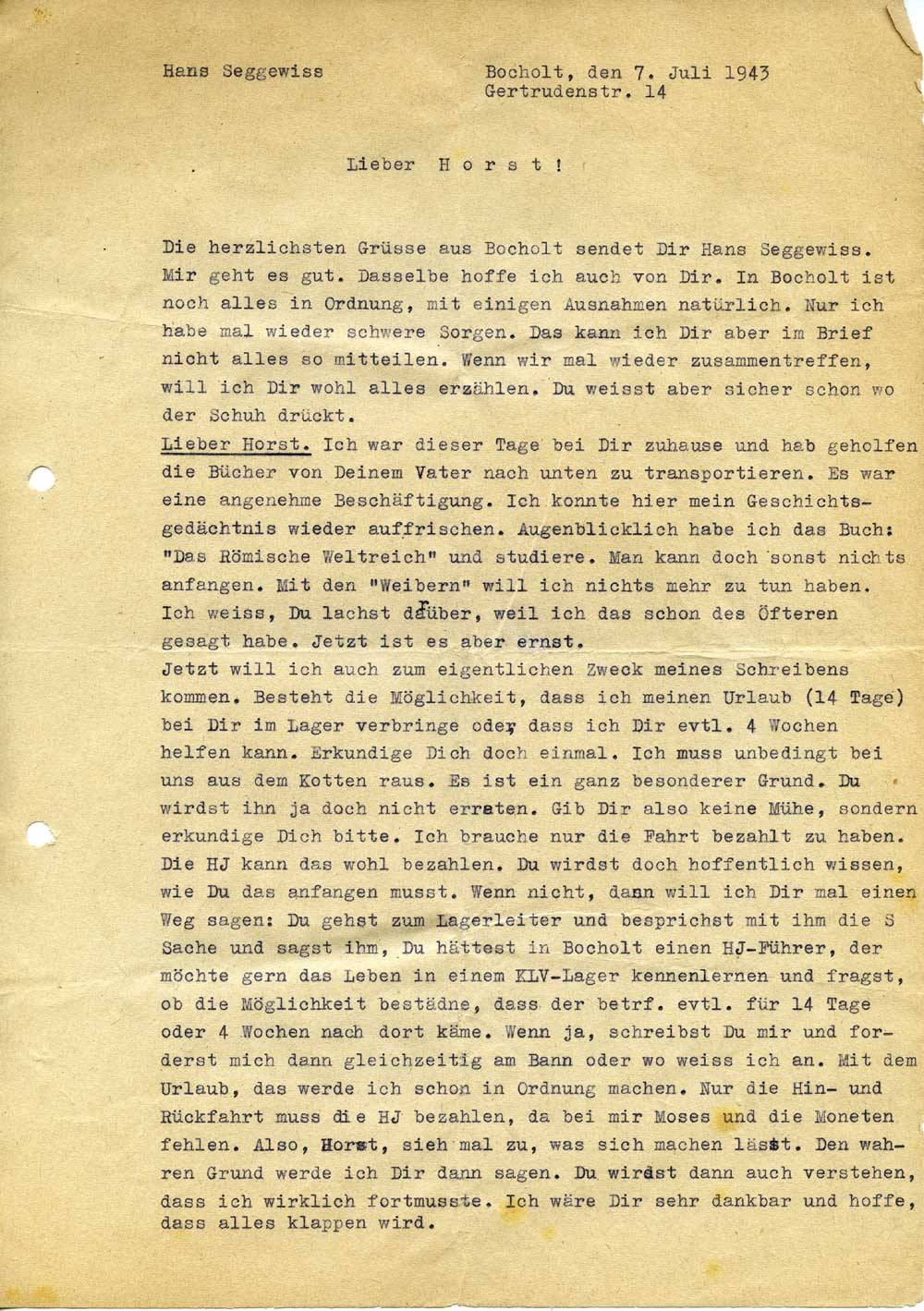 Jetzt will ich auch zum eigentlichen Zweck meines Schreibens kommen. Besteht die Möglichkeit, dass ich meinen Urlaub (14 Tage) bei Dir im Lager verbringe oder dass ich Dir evtl. 4 Wochen helfen kann. Erkundige Dich doch einmal. Ich muss unbedingt bei uns aus dem Kotten raus. Es ist ein ganz besonderer Grund. Du wirdst ihn ja doch nicht erraten. Gib Dir also keine Mühe, sondern erkundige Dich bitte. Ich brauche nur die Fahrt bezahlt zu haben. Die HJ kann das wohl bezahlen. Du wirdst doch hoffentlich wissen, wie Du das anfangen musst. Wenn nicht, dann will ich Dir mal einen Weg sagen: Du gehst zum Lagerleiter und besprichst mit ihm die Sache und sagst ihm, Du hättest in Bocholt einen HJ-Führer, der möchte gern das Leben in einem KLV-Lager kennenlernen und fragst, ob die Möglichkeit bestände, dass der betrf. evtl. für 14 Tage oder 4 Wochen nach dort käme. Wenn ja, schreibst Du mir und forderst mich dann gleichzeitig am Bann oder wo weiss ich an. Mit dem Urlaub, das werde ich schon in Ordnung machen. Nur die Hin- und Rückfahrt muss die HJ bezahlen, da bei mir Moses und die Moneten fehlen. Also, Horst, sieh mal zu, was sich machen lässt. Den wahren Grund werde ich Dir dann sagen. Du wirdst dann auch verstehen, dass ich wirklich fortmusste. Ich wäre Dir sehr dankbar und hoffe, dass alles klappen wird.