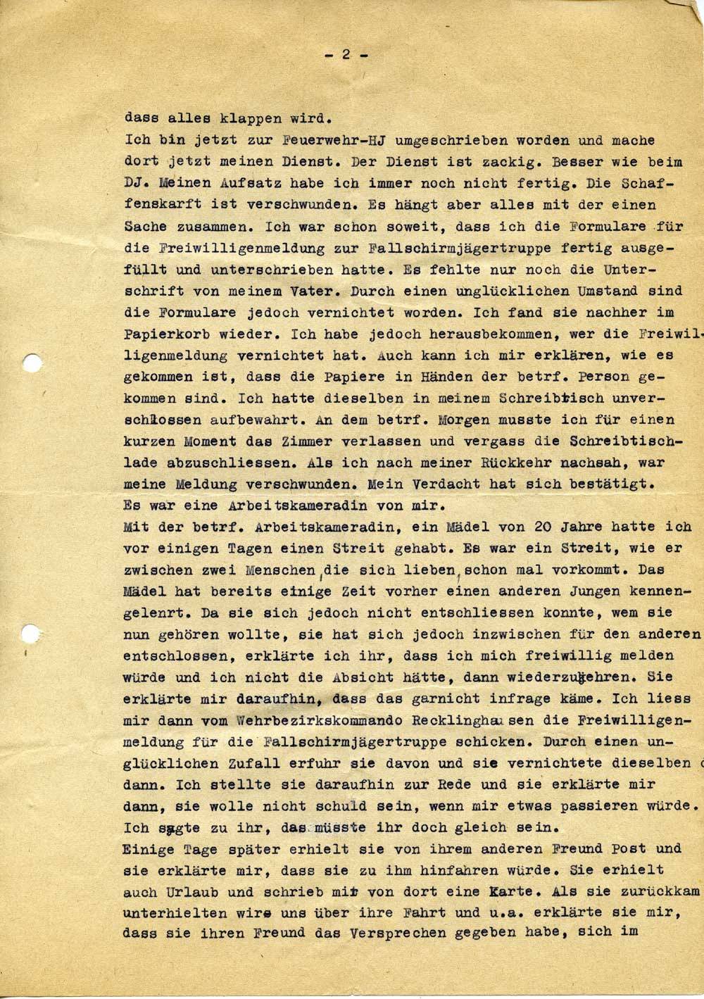Mit der betrf. Arbeitskameradin, ein Mädel von 20 Jahre hatte ich vor einigen Tagen einen Streit gehabt. Es war ein Streit, wie er zwischen zwei Menschen, die sich lieben, schon mal vorkommt. Das Mädel hat bereits einige Zeit vorher einen anderen Jungen kennengelernt. Da sie sich jedoch nicht entschliessen konnte, wem sie nun gehören wollte, sie hat sich jedoch inzwischen für den anderen entschlossen, erklärte ich ihr, dass ich mich freiwillig melden würde und ich nicht die Absicht hätte, dann wiederzukehren. Sie erklärte mir daraufhin, dass das garnicht infrage käme. Ich liess mir dann vom Wehrbezirkskommando Recklinghausen die Freiwilligenmeldung für die Fallschirmjägertruppe schicken. Durch einen unglücklichen Zufall erfuhr sie davon und sie vernichtete dieselben dann. Ich stellte sie daraufhin zur Rede und sie erklärte mir dann, sie wolle nicht schuld sein, wenn mir etwas passieren würde. Ich sagte zu ihr, das müsste ihr doch gleich sein.