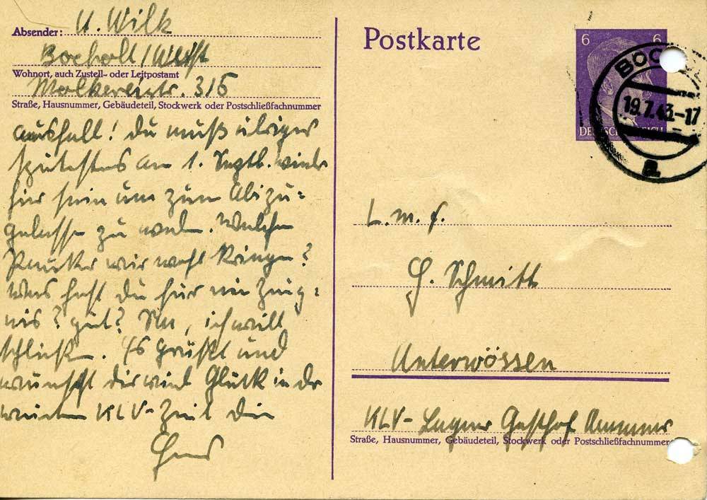 ausfall! Du muß übrigens spätestens am 1. Septb. wieder hier sein um zum Abi zugelassen zu werden. Welchen Pauker wir wohl kriegen? Was hast Du für ein Zeugnis? Gut? Na, ich will schließen. Es grüßt und wünscht Dir viel Glück in der weiteren KLV-Zeit Dein