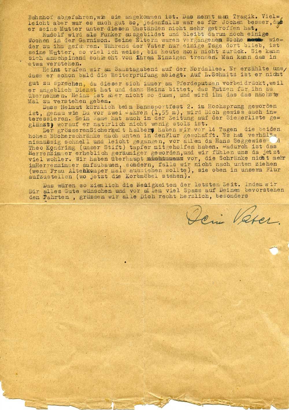 Auf dem Kreistag in Traunstein hast Du ja gebührend geglänzt. Wie wird da unser Sohn gestrahlt haben, als er so vor allem Volke herausgestrichen wurde! Nun, der Ruhm ist mittlerweile schon bis Bocholt gedrungen, und allenthalben spricht man davon. Frl. Johnen wusste schon davon, ehe wir Deinen Brief hatten. Wem hattest Du das denn mitgeteilt? Und Herr Moenche, der aus Bochum stammt, hatte es in der Bochumer Zeitung gelesen, und er meinte, der Erfolg der Bochumer Jungen sei für die Bochumer Bevölkerung, die von den Luftangriffen auch so schwer getroffen wurde, ein Trost in dieser schweren Zeit.