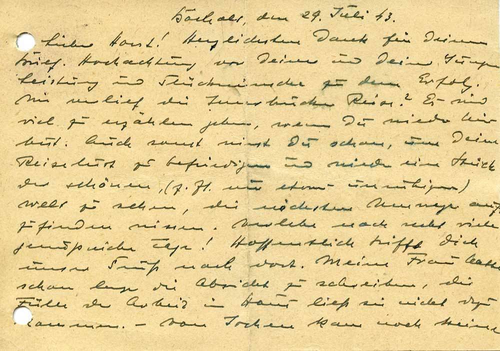Lieber Horst! Herzlichen Dank für Deinen Brief. Hochachtung vor Deiner und Deiner Jungen Leistung und Glückwünsche zu dem Erfolg. Wie verlief die Innsbrucker Reise? Es wird viel zu erzählen geben, wenn Du wieder hier bist. Auch sonst wirst Du schon, um Deine Reiselust zu befriedigen und wieder ein Stück der schönen, (z. Zt nur etwas unruhigen) Welt zu sehen, die nächsten Umwege aufzufinden wissen. Verlebe noch recht viele [?] Tage! Hoffentlich trifft Dich unser Gruß noch dort. Meine Frau hatte schon lange die Absicht zu schreiben, die Füller der Arbeit im Haus ließ sie nicht dazu kommen. – Von Jochen kam noch keine