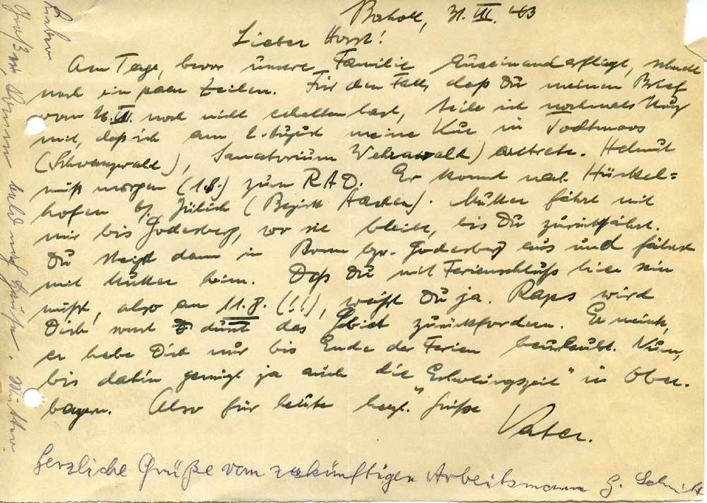 Am Tage, bevor unsere Familie auseinanderfliegt, schnell noch ein paar Zeilen. Für den Fall, daß Du meinen Brief vom 26.VII. noch nicht erhalten hast, teile ich nochmals kurz mit, daß ich am 2. August meine Kur in Todtmoos (Schwarzwald), Sanatorium Wehrawald) antrete. Helmut muß morgen (1.8.) zum RAD. Er kommt nach Hückelhofen b/. Jülich (Bezirk Aachen). Mutter fährt mit mir bis Godesberg, wo sie bleibt, bis Du zurückfährst. Du steigst dann in Bonn bzw. Godesberg aus und fährst mit Mutter heim. Daß Du mit Ferienschluß hier sein mußt, also am 11.8. (!!), weißt Du ja. Raps wird Dich sonst durch das Gebiet zurückfordern. Er meinte, er habe Dich nur bis Ende der Ferien beurlaubt. Nun, bis dahin genügt ja auch die „Erholungszeit“ in Oberbayern. Also für heute herzl. Grüße
