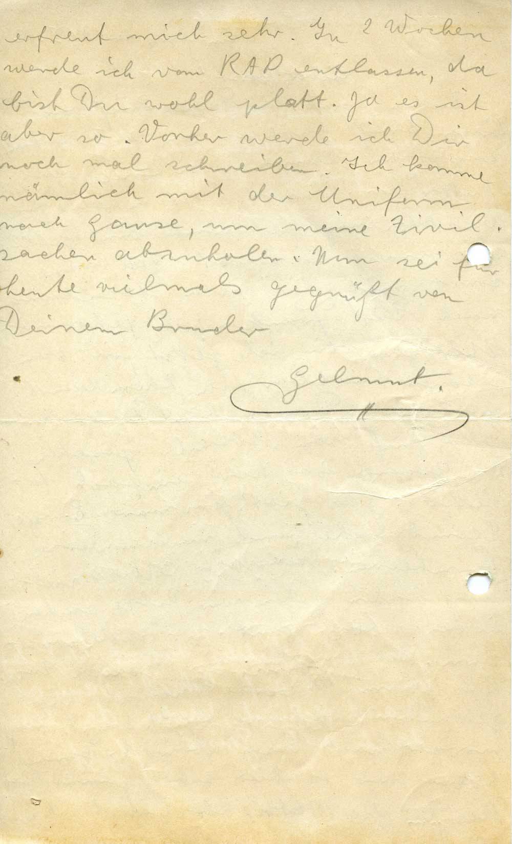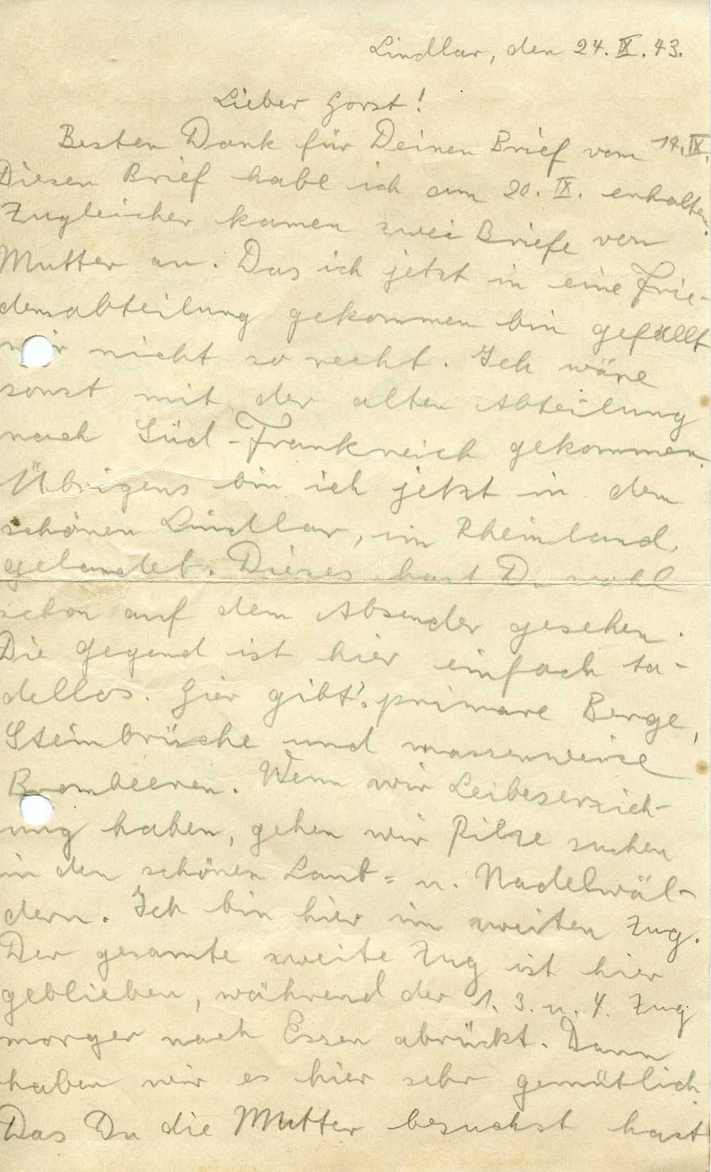 Besten Dank für Deinen Brief vom 17.IX. Diesen Brief habe ich am 20.IX. erhalten. Zugleicher kamen zwei Briefe von Mutter an. Das ich jetzt in eine Friedensabteilung gekommen bin gefällt mir nicht so recht. Ich wäre sonst mit der alten Abteilung nach Süd-Frankreich gekommen. Übrigens bin ich jetzt in dem schönen Lindlar, im Rheinland, gelandet. Dieses hast Du wohl schon auf dem Absender gesehen. Die Gegend ist hier einfach tadellos. Hier gibt’s primare Berge, Steinbrüche und massenweise Brombeeren. Wenn wir Leibeserziehung haben, gehen wir Pilze suchen in den schönen Laub- u. Nadelwäldern. Ich bin hier im zweiten Zug. Der gesamte zweite Zug ist hier geblieben, während der 1., 3. u. 4. Zug morgen nach Essen abrückt. Dann haben wir es hier sehr gemütlich. Das Du die Mutter besuchst hast