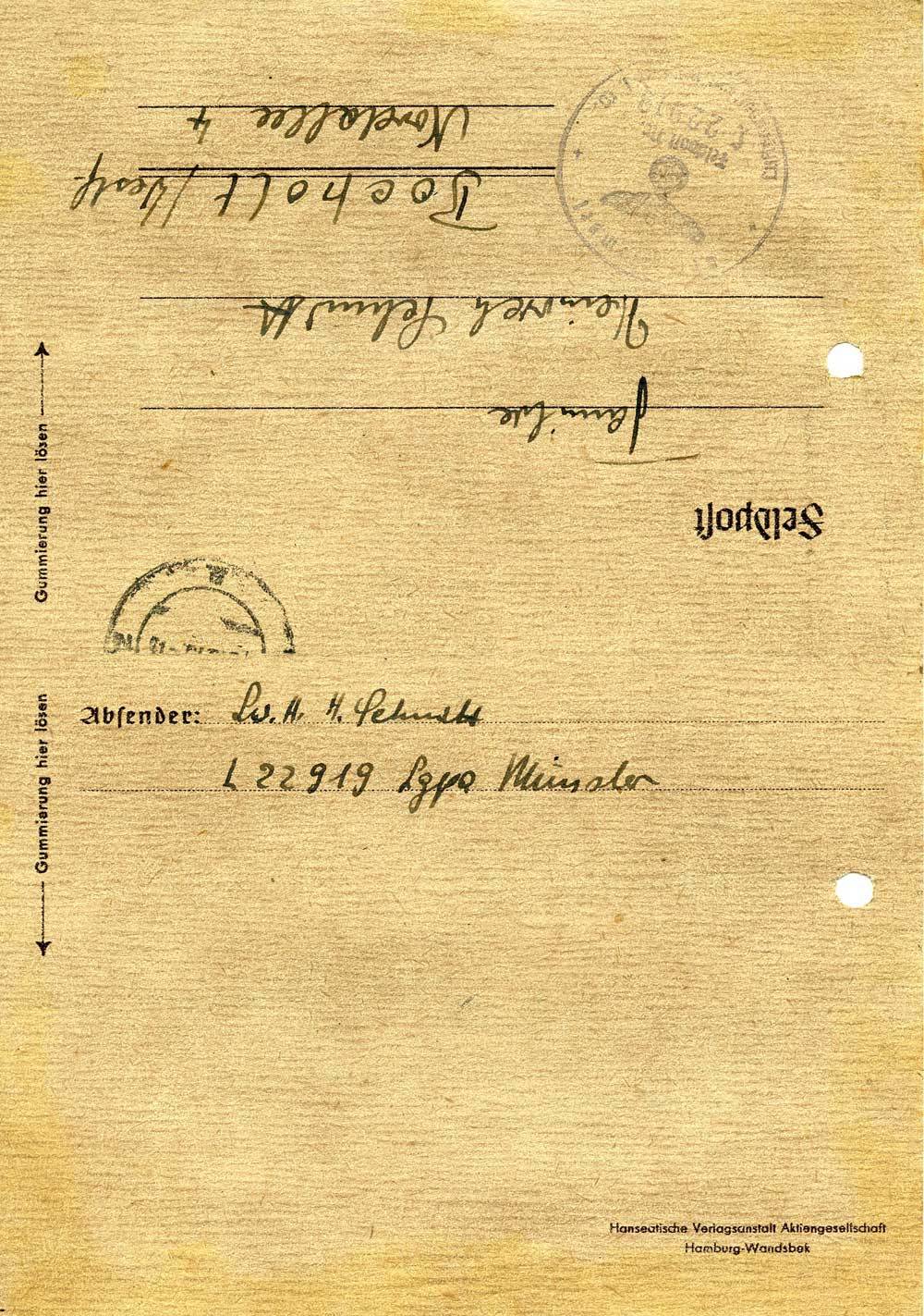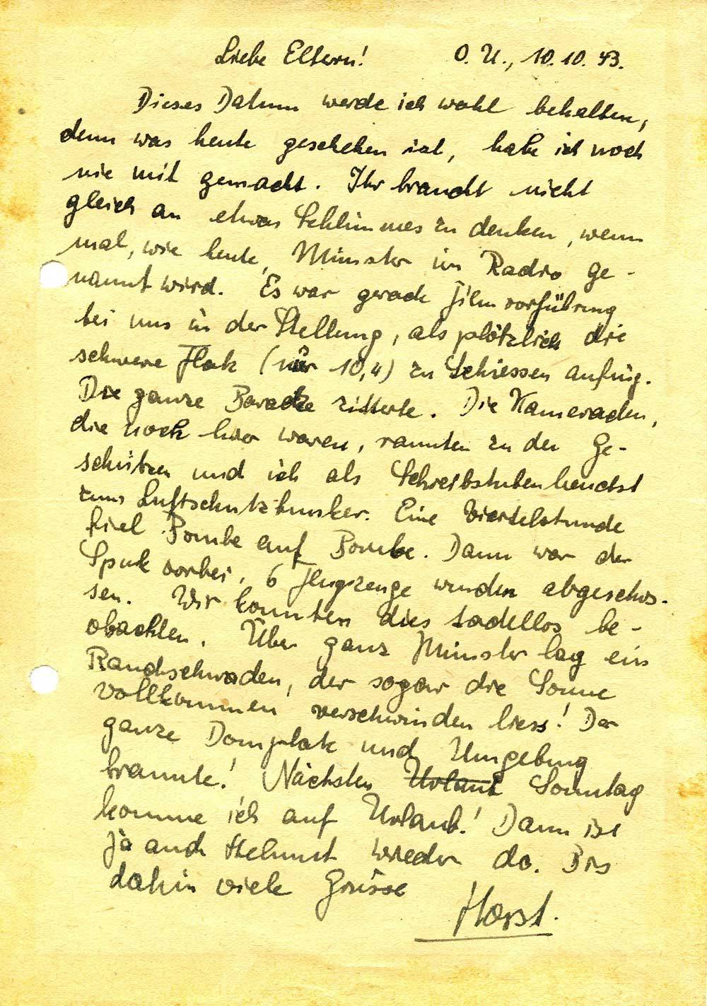 Dieses Datum werde ich wohl behalten, denn was heute geschehen ist, habe ich noch nie mit gemacht. Ihr braucht nicht gleich an etwas Schlimmes zu denken, wenn mal, wie heute, Münster im Radio genannt wird. Es war gerade Filmvorführung bei uns in der Stellung, als plötzlich die schwere Flak ([?] 10,4) zu Schiessen anfing. Die ganze Baracke zitterte. Die Kameraden, die noch hier waren, rannten zu den Geschützen und ich als Schreibstubenhenckst zum Luftschutzbunker. Eine Viertelstunde fiel Bombe auf Bombe. Dann war der Spuk vorbei, 6 Flugzeuge wurden abgeschossen. Wir konnten dies tadellos beobachten. Über ganz Münster lag ein Rauchschwaden, der sogar die Sonne vollkommen verschwinden liess! Der ganze Domplatz und Umgebung brannte! Nächsten Sonntag komme ich auf Urlaub! Dann ist ja auch Helmut wieder da. Bis dahin viele Grüsse