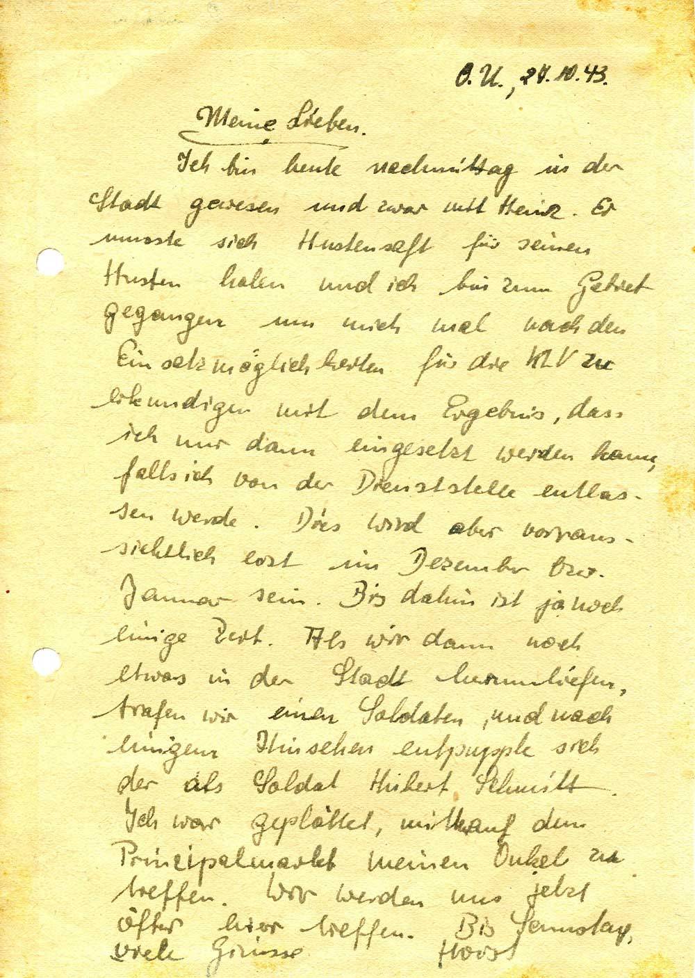 Ich bin heute nachmittag in der Stadt gewesen und zwar mit Heinz. Er musste sich Hustensaft für seinen Husten holen und ich bin zum Gebiet gegangen um mich mal nach den Einsatzmöglichkeiten für die KLV zu erkundigen mit dem Ergebnis, dass ich nur dann eingesetzt werden kann, falls ich von der Dienststelle entlassen werde. Dies wird aber voraussichtlich erst im Dezember bzw. Januar sein. Bis dahin ist ja noch einige Zeit. Als wir dann noch etwas in der Stadt herumliefen, trafen wir einen Soldaten, und nach einigem Hinsehen entpuppte sich der als Soldat Hubert Schmitt. Ich war geplättet, mitten auf dem Prinzipalmarkt meinen Onkel zu treffen. Wir werden uns jetzt öfter hier treffen. Bis Samstag, viele Grüsse